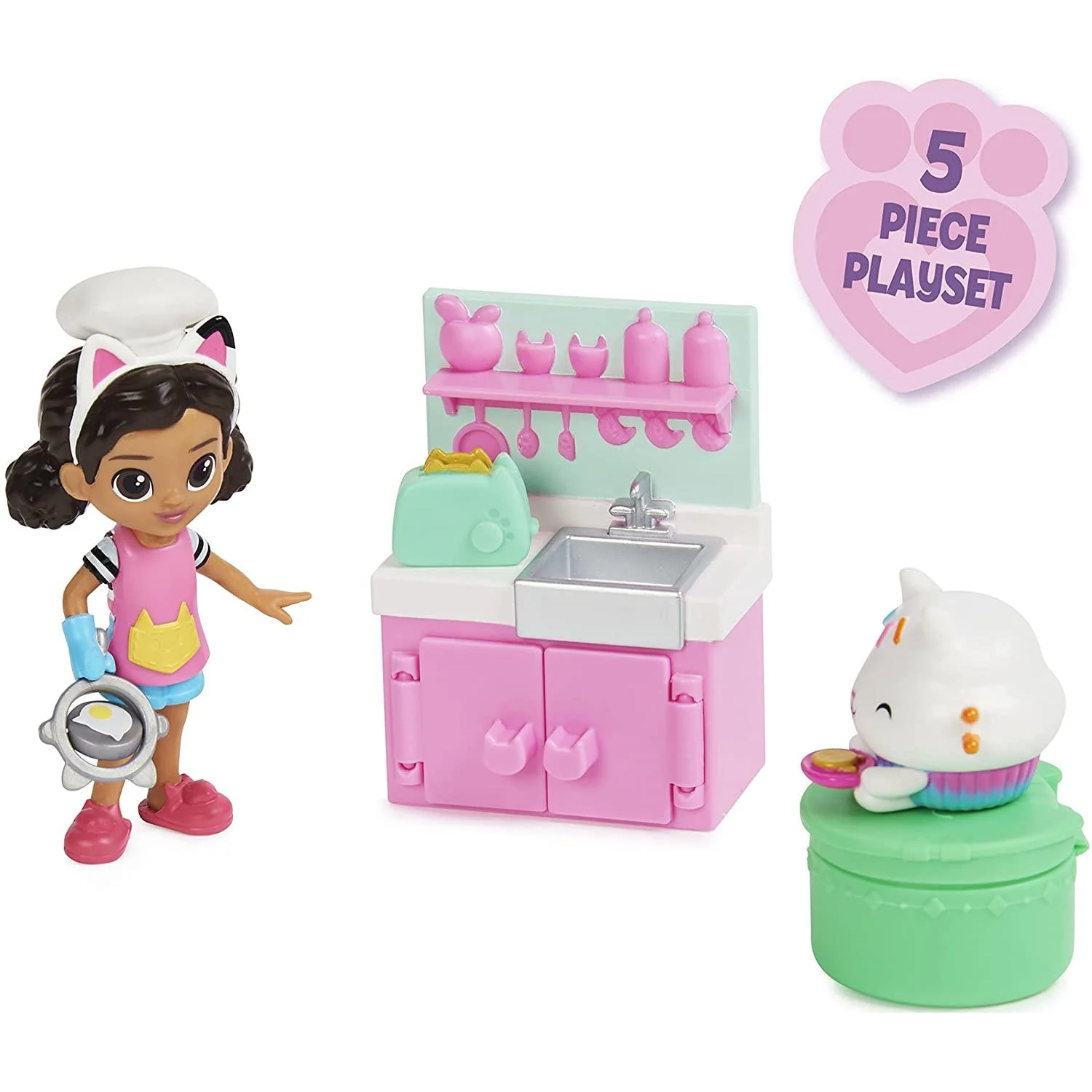 Pressione as orelhas de gato da figura colecionável Gabby Girl, para virar a frigideira em sua mão, para fingir que está cozinhando e para ajudá-la a ser criativa na cozinha. ENTREGA PARA CASA DE BONECAS E ACESSÓRIO SURPRESA: Este divertido conjunto de figuras inclui uma figura de Cakey Cat e uma Dollhouse Delivery - abra a caixa da entrega para revelar um acessório de cozinha misterioso fofo e rosa com gatinho! PEÇA DE MÓVEIS DE COZINHA: Adicione à sua diversão fingida com a pia da cozinha e o armário. As portas do armário abrem e fecham! Use sua imaginação para cozinhar aventuras com Gabby e Cakey Cat! DESBLOQUEIE UMA RECOMPENSA ESPECIAL: O Lunch and Munch Set tem um código QR dentro da Dollhouse Delivery – digitalize-o para desbloquear uma recompensa exclusiva no aplicativo gratuito Gabby's Dollhouse (disponível para iOS e Android)! RECHEIOS PERFEITOS PARA CESTA DE PÁSCOA: Brinquedos, figuras, bichos de pelúcia, carros de brinquedo e conjuntos de brinquedos Gabby's Dollhouse são um ótimo complemento e ovos de Páscoa para construir uma cesta de presentes ou presente de aniversário. Inclui: 1 Gabby Figure, 1 Cakey Cat Figure, 1 Mobília, 1 Dollhouse Delivery, 1 Acessório