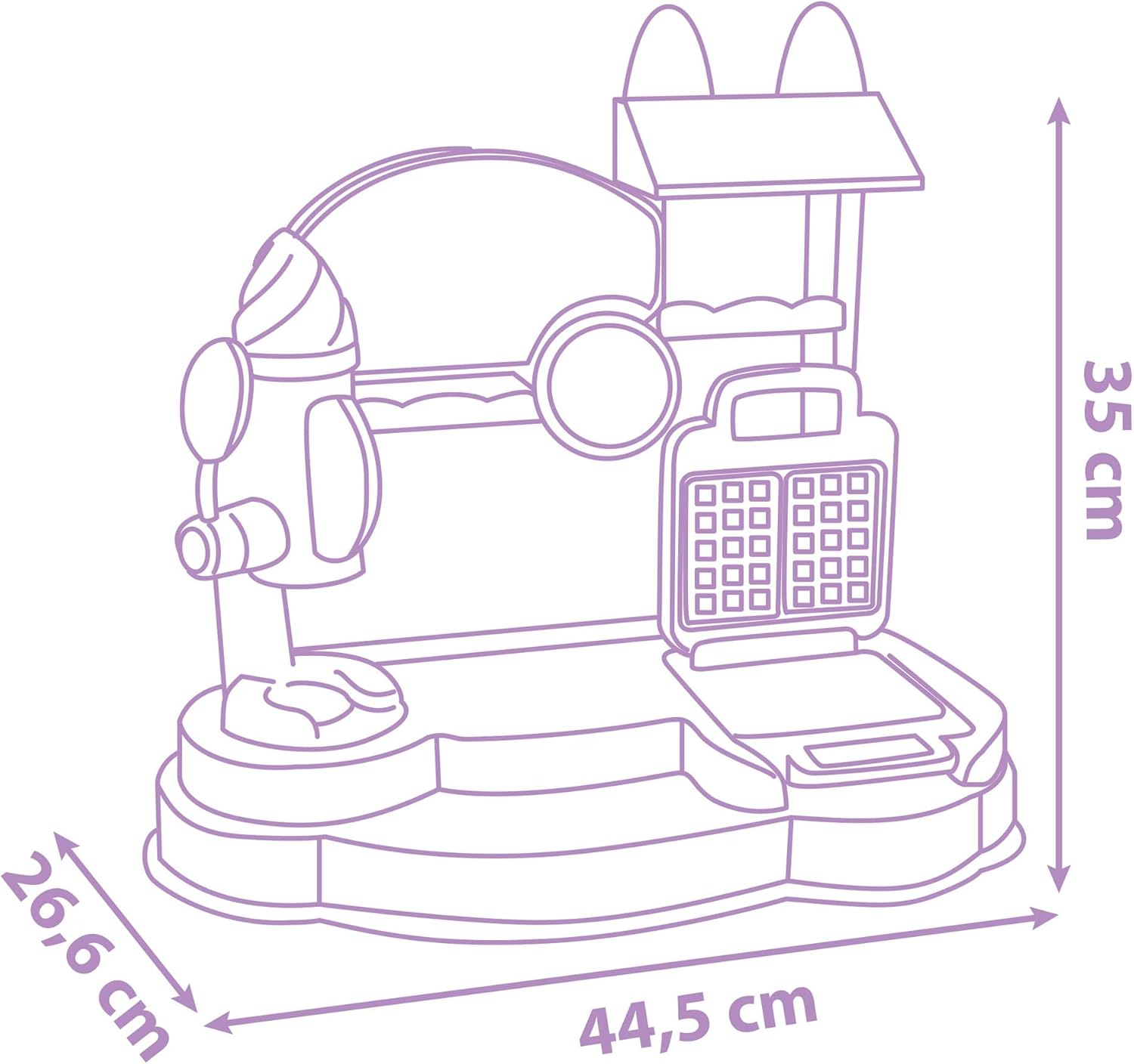 Fantástica sorveteria - Bem-vindo à encantadora gelataria de Gabby: A máquina de gelados é usada para dispensar bolas de gelado coloridas, enquanto ao lado cria waffles crocantes e guloseimas decoradas com carinho. Ampla gama de acessórios - a cafeteria infantil contém um total de 20 acessórios, incluindo 5 bolas de gelado, copas de gelado, waffles, uma colher de gelado e vários alimentos para brincar Com um design divertido da Gabby - como brinquedo oficial licenciado da Gabby's Dollhouse, a fábrica de gelados foi projetada no estilo da série, com adesivos coloridos dos personagens da série para colá-los você mesmo! Fabricado em França - as meninas e os meninos a partir dos 3 anos podem usar a gelataria para representar as aventuras mágicas da casa de bonecas de Gabby, inventar os seus próprios jogos de RPG e soltar a sua criatividade. Qualidade Smoby desde 1924 - Graças a constantes controlos de qualidade, muitos anos de experiência e uso de materiais de alta qualidade e instalações de produção de última geração, garantimos brinquedos seguros. Licença Gabby's Dollhouse 100% oficial