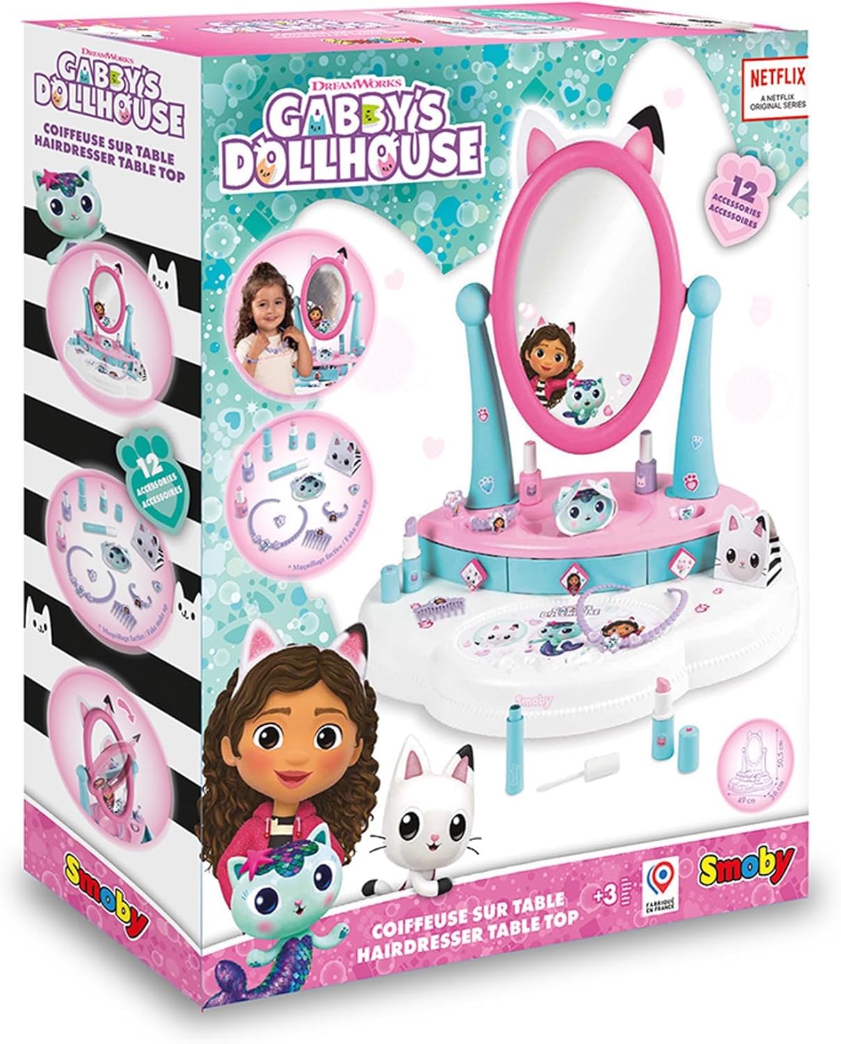O conjunto de cabeleireiro da Smoby Gabby's Dollhouse combina exclusivamente os três temas de jogo mais populares relacionados à beleza e aos cuidados: cabeleireiro, cuidados com as unhas e maquilhagem Um total de 12 acessórios com funções mecânicas para que a diversão nunca termina (cosméticos falsos de jogo e recipientes vazios): dois batons, dois vernizes de unhas, máscara de pestanas, pente para o cabelo, colar, uma pulseira bonita, dois anéis e duas caixas vazias estão disponíveis para um amplo estilo. Tamanho muito confortável. O espelho basculante grande pode ser facilmente ajustado à altura da criança. Três gavetas oferecem muito espaço para guardar os cosméticos de jogo incluídos na ponta dos dedos. Dimensões do produto montado: 49 x 36 x 50,5 cm