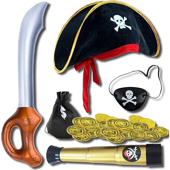 O disfarce de pirata infantil inclui: 1 chapéu de pirata, 1 pala para olho, 1 telescópio, 1 sabre pirata, 1 porta-moedas, 20 moedas de ouro. Este jogo de fantasia de pirata de Halloween ajudará o seu filho a se tornar um verdadeiro aventureiro. Imagine, explore, experimente o mundo do desconhecido.