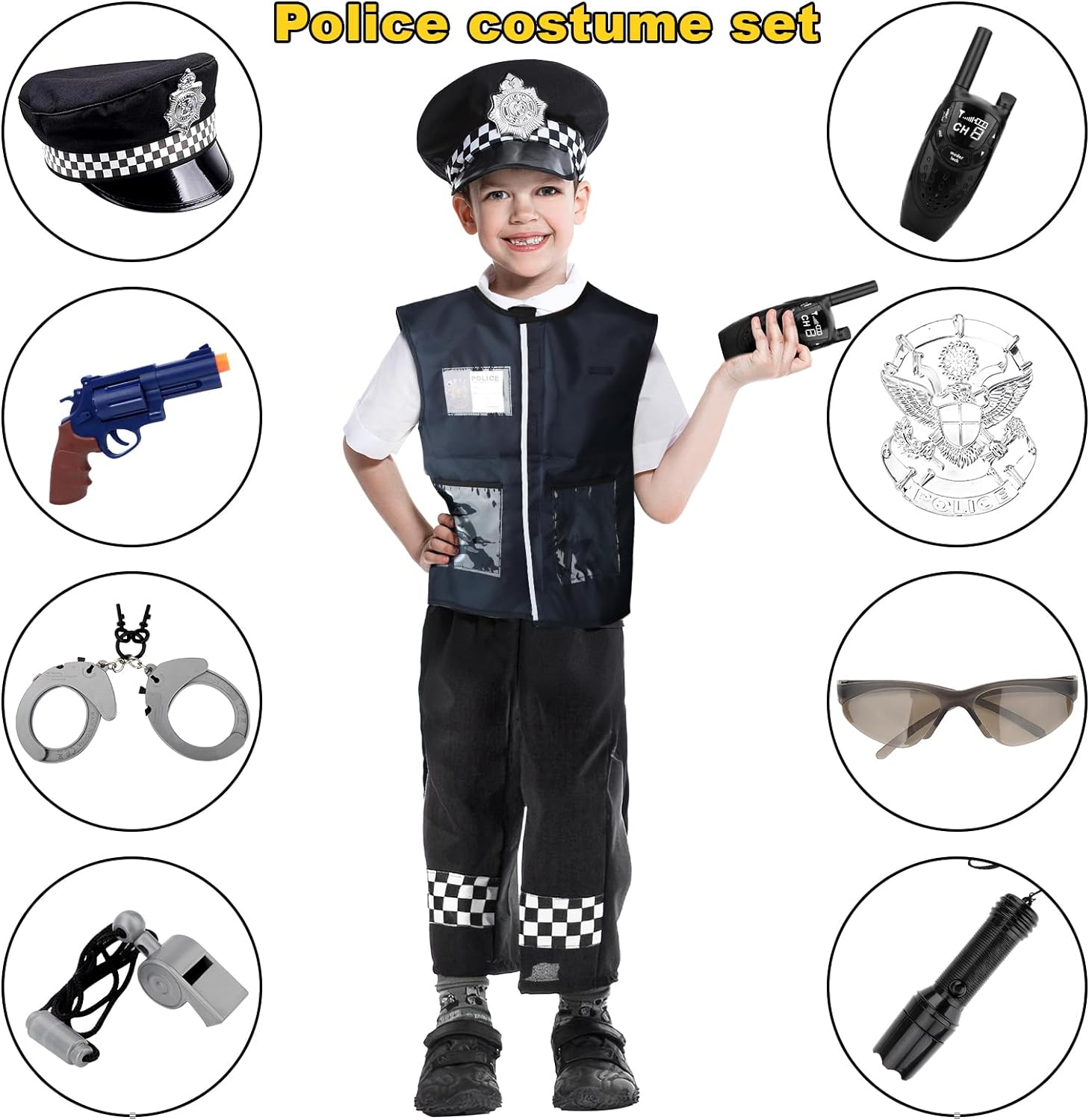 Acessórios: Este conjunto inclui colete de polícia, boné, lanterna, óculos, algemas, arma, walkie-talkie, placa de polícia, casaco, apito e mochila de armazenamento.