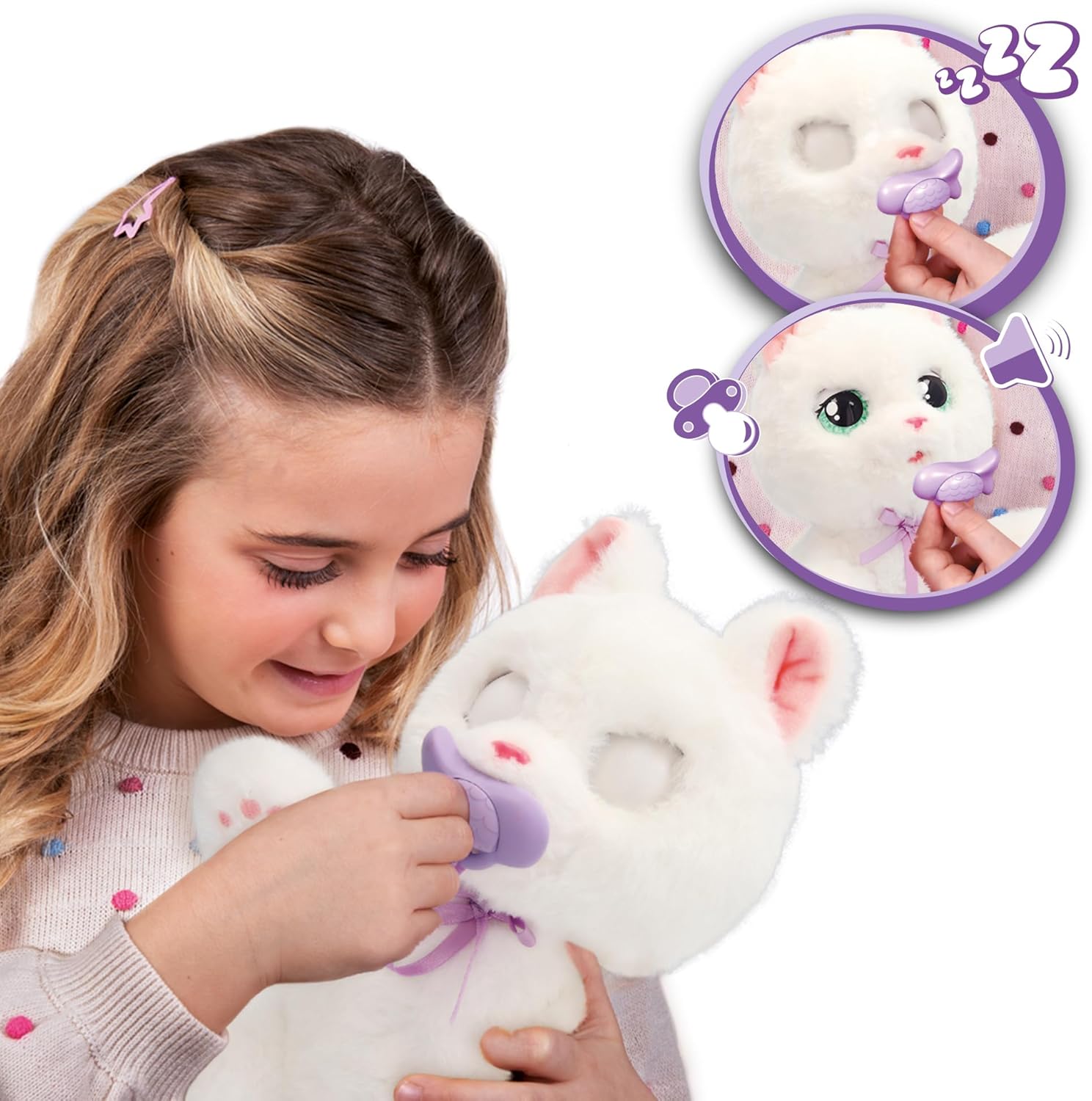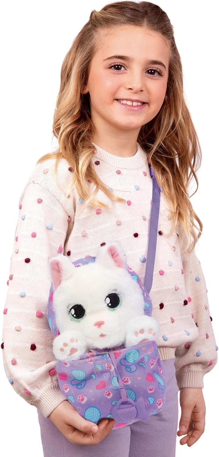 Com o Baby Paws gato branco, as crianças podem desfrutar de horas de jogo criativo. Este simpático gatinho vem com a sua própria bolsa e uma chupeta, o que o torna perfeito para levar a qualquer lugar. Ao colocar-lhe a chupeta, o gato fecha os olhos e emite sons adoráveis, como se estivesse a dormir placidamente. Além disso, quando o retiras da sua mantinha, podes descobrir o seu corpo suave e terno, ideal para abraçar.