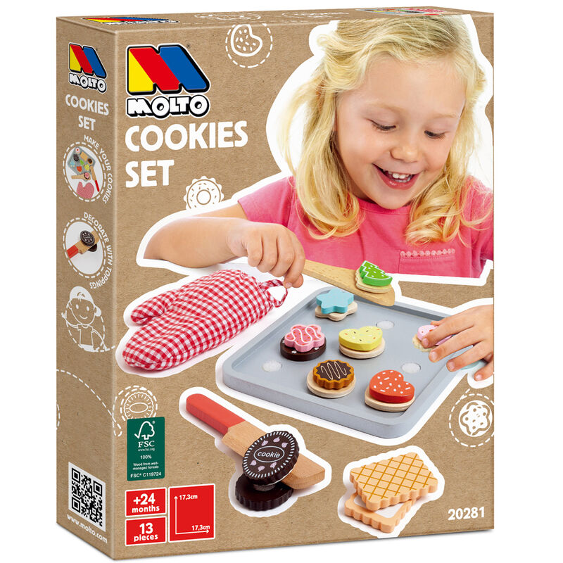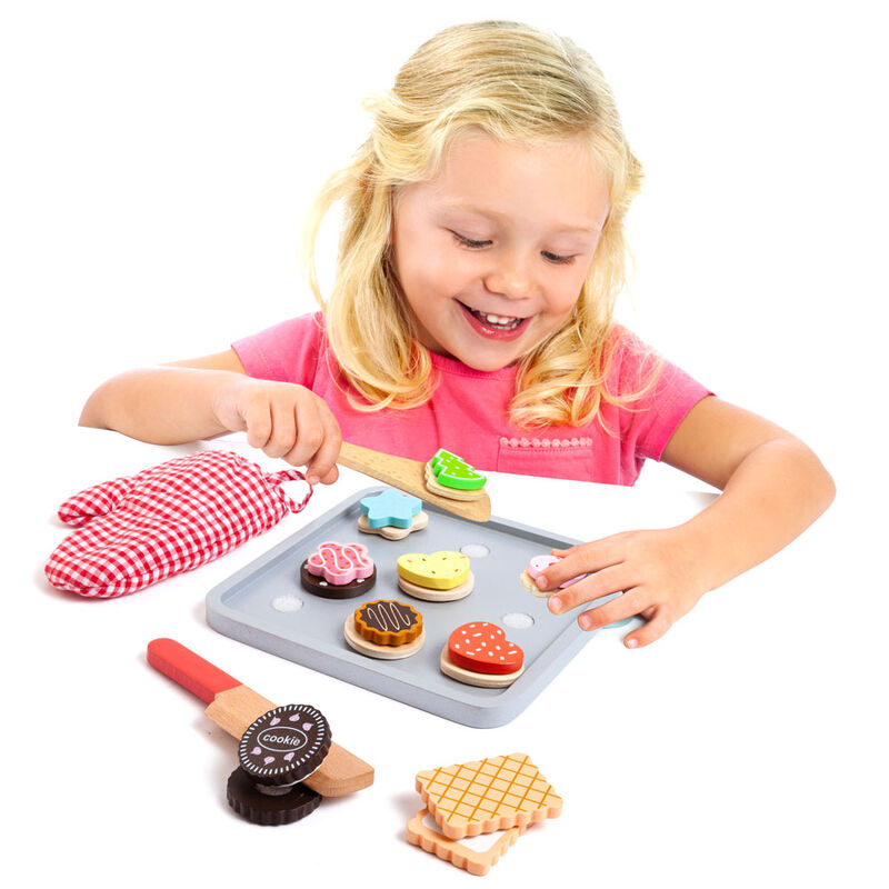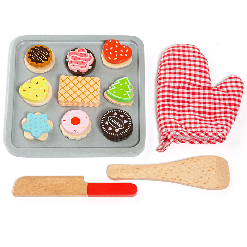 Idade: +24 meses. Tamanho: 20x5x26cm. Conjunto de biscoitos de madeira com assadeira de madeira, inclui espátula, faca de madeira, luva de forno e seis biscoitos removíveis para brincar.