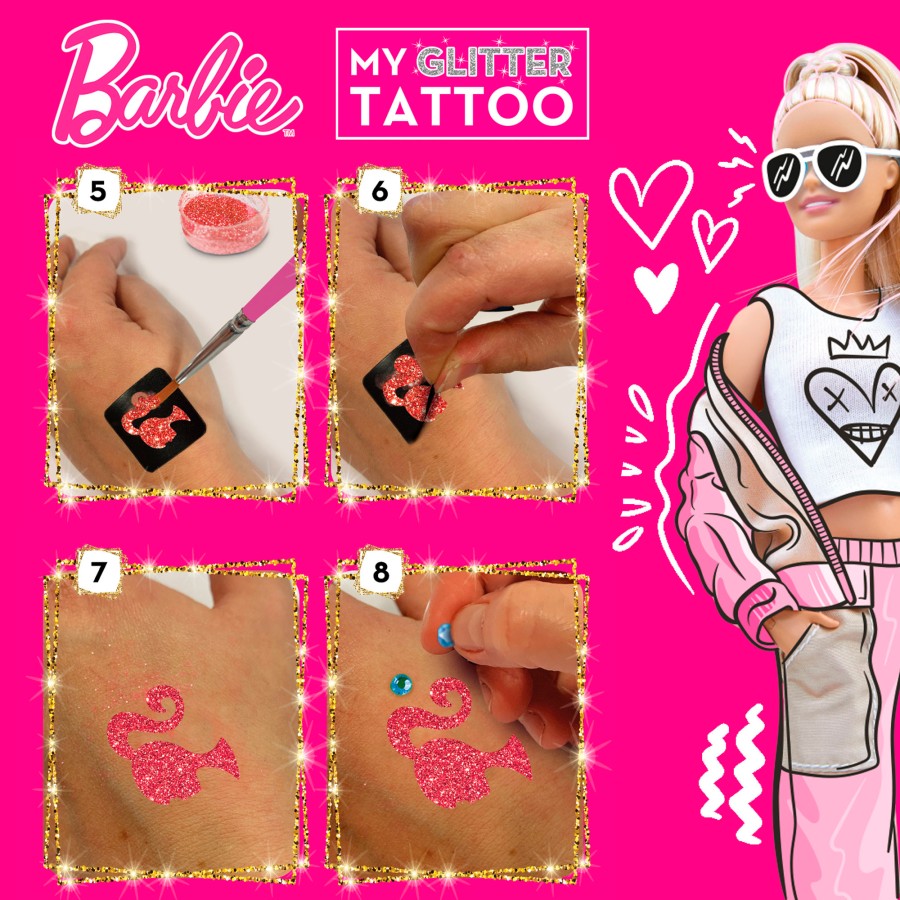 Idade: brinquedo recomendado a partir dos 5 anos Enche o teu corpo com fantásticas tatuagens temporárias de purpurinas graças ao Estúdio de Tatuagens Barbie! Inclui: estênceis, 10 frascos pequenos de purpurinas coloridas (laranja, dourado, verde, azul, azul-marinho, lilás, branco, prateado, fúcsia e roxo), gemas adesivas multicoloridas, 2 pincéis (1 para purpurinas e 1 para pré-base), 1 frasco de pré-base para tatuagens e 1 paleta para misturar. Como jogar: escolhe o estêncil, aplica a pré-base com um pincel, espalha-a bem por todo o estêncil, aplica as purpurinas com o outro pincel, retira o estêncil e decora a tatuagem com pedras preciosas. Valores: desenvolve a destreza manual, a coordenação óculo-manual, a motricidade fina e a criatividade