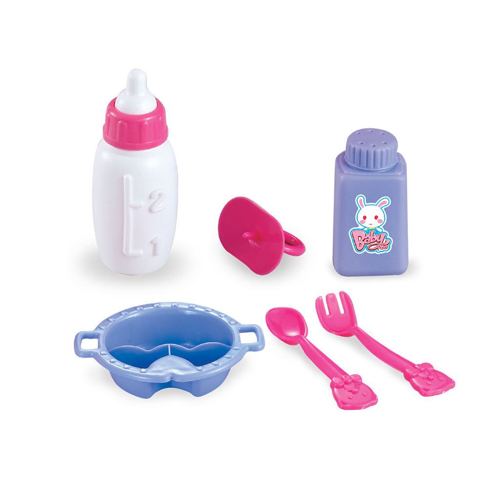 Inclui 6 acessórios: 1 colher; 1 garfo; 1 prato de bebé; 1 biberão; 1 chupeta; 1 frasco.