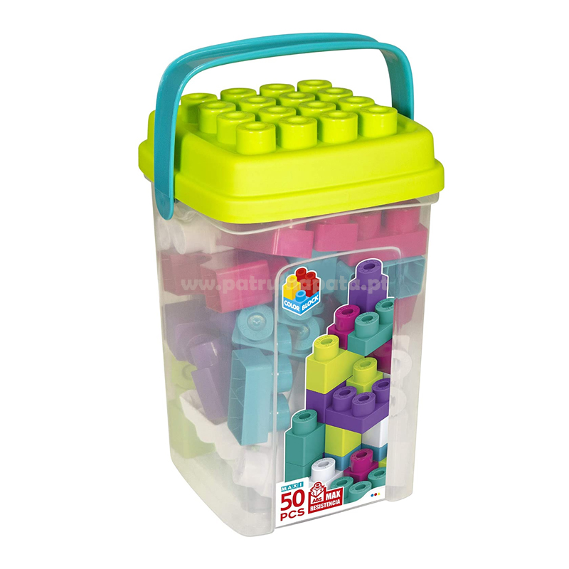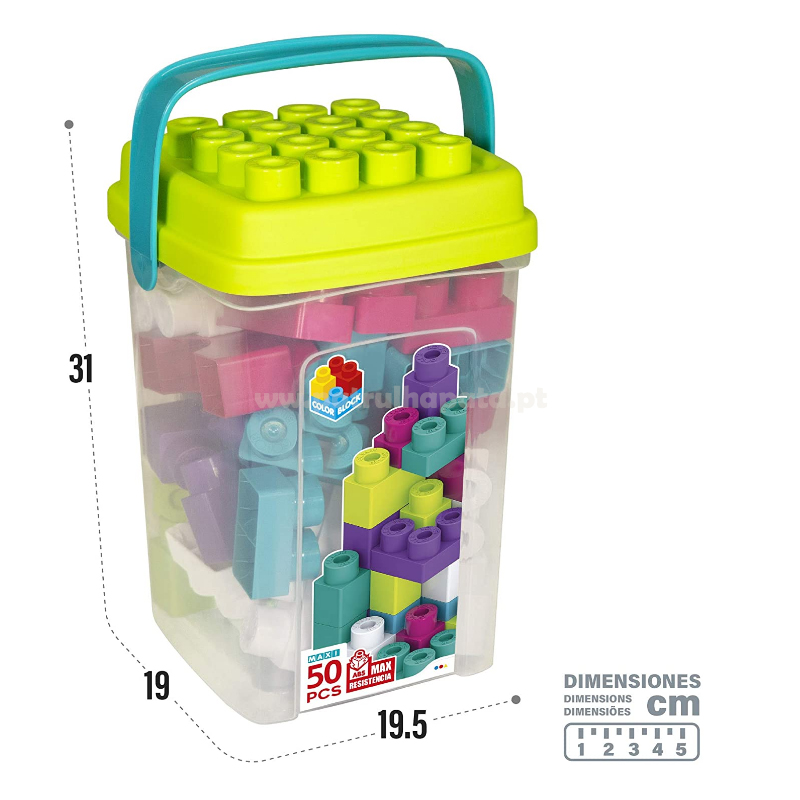 Cubo com 50 blocos de tamanho Maxi Color Block, peças em amarelo, vermelho, verde, azul e laranja para construções muito divertidas!