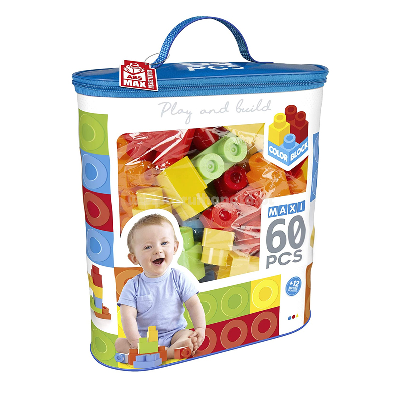 Bolsa com 60 blocos Color Block tamanho Maxi, peças em cores modernas: lilás, rosa, branco, verde e azul, para construções muito divertidas!