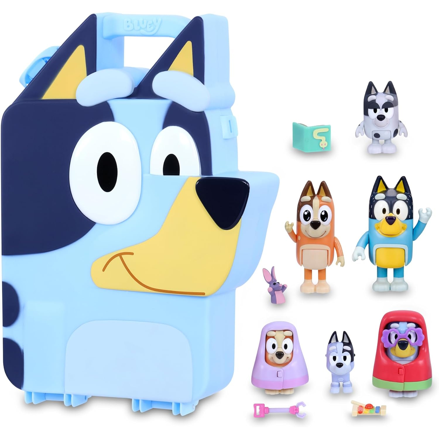 O brinquedo Collector's Case de Bluey num Playset Play & Go; uma caixa que se abre para criar uma divertida área de jogos para todas as suas figuras da coleção Bluey. Abre-o para jogar! Esta caixa para colecionáveis Bluey tem a forma da cabeça de Bluey. Abre-se e desdobra-se tornando-se um playset para criar uma área de jogo; no interior há um autocolante de papel com a imagem de um tapete da casa de Bluey Agora pode jogar fora de casa e levar Bluey e seus amigos para qualquer lugar, leve-o para casa dos seus amigos para brincar ou de férias Quando terminar, basta colocar todas as figuras dentro da pasta, fechá-la e deixar tudo arrumado e levá-la confortavelmente com a sua alça O playset da escola inclui 5 figuras de: Bluey, Bingo, Bandit, Chilli e Muffin de 6 a 7 centímetros, articuladas e que podem ser colocadas em diferentes posições com os braços e corpo móveis, para um jogo realista; também inclui 4 pequenos acessórios de jogos complementares e fantasias para Bluey e Bingo