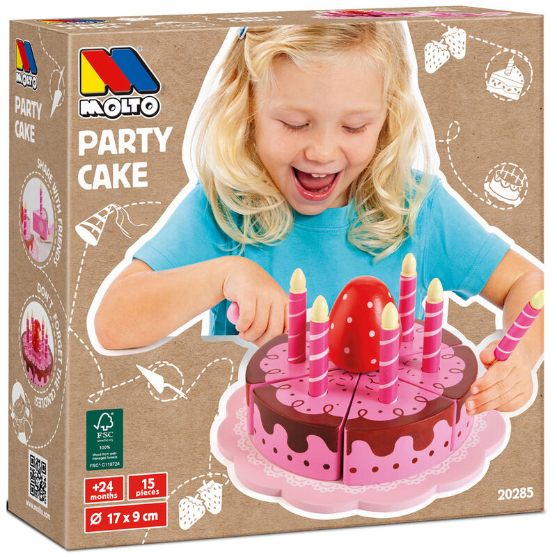 Idade: +24 meses. Tamanho: 26x8x26,5cm. Bolo de aniversário de brinquedo de madeira, pré-cortado em 6 partes, 6 velas, ovo decorativo, bandeja de apresentação e espátula.