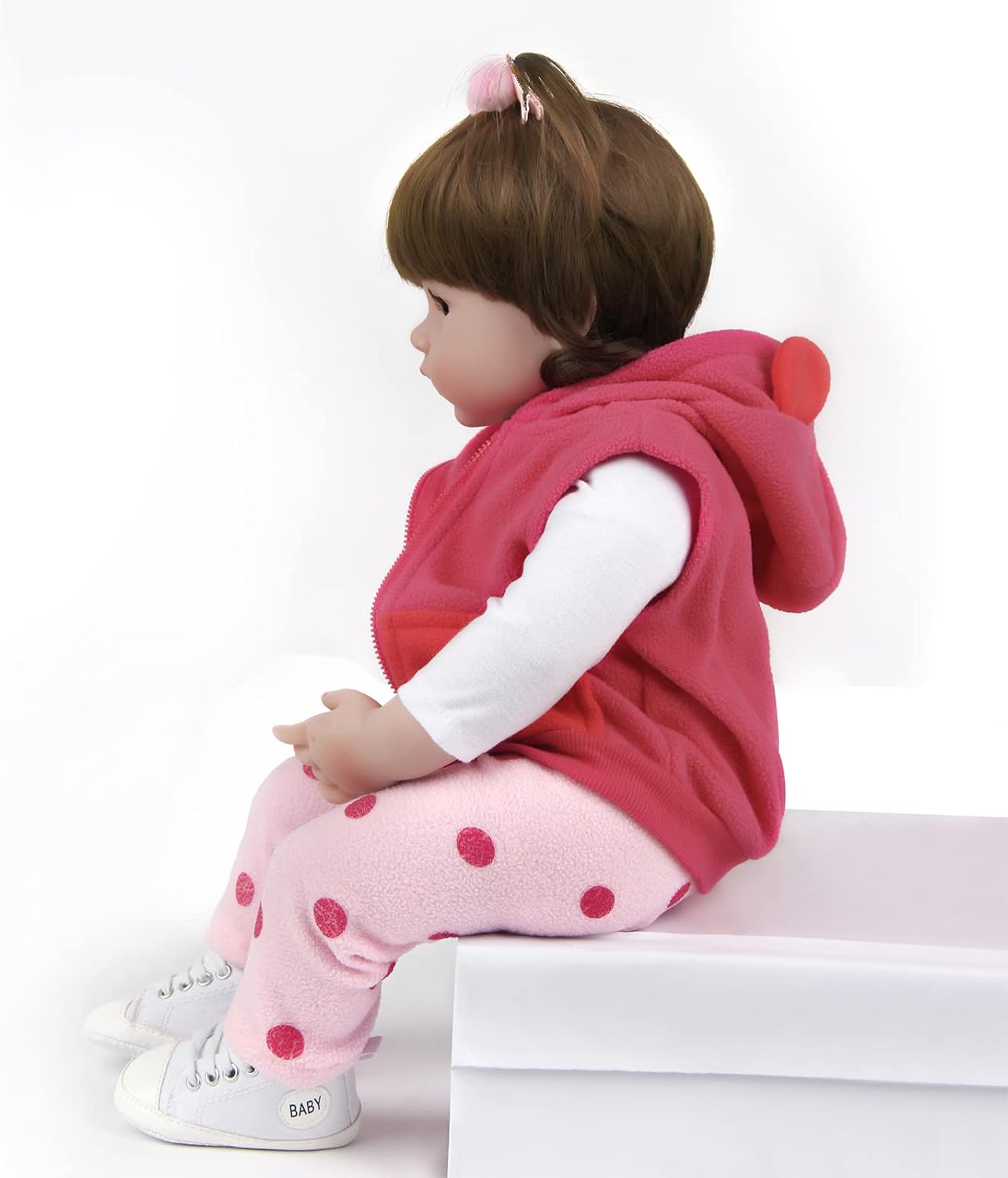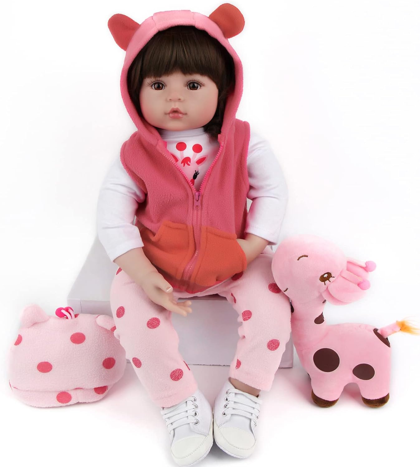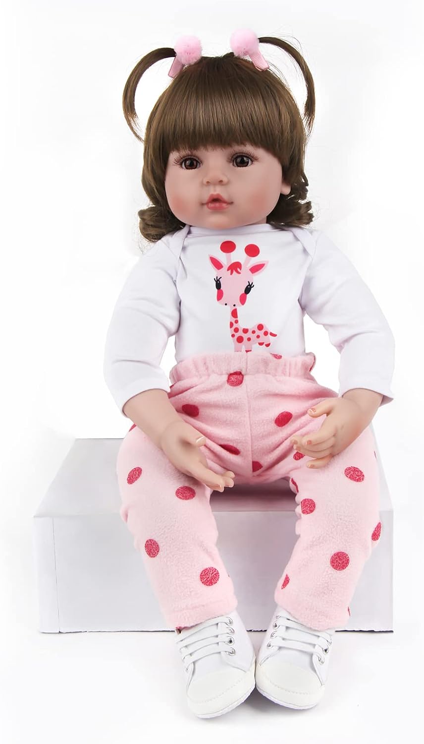 Bebé reborn a cabeça, 3/4 dos braços e 3/4 das pernas são feitas de material de vinil silicone. O ombro e o corpo são feitos de tecido com enchimento interno de algodão PP. Vai sentir-se muito bem quando tocar no pulso. Os membros são móveis, a boneca pode sentar-se e deitar-se facilmente, mas não pode ficar de pé e falar. O corpo não tem género.
