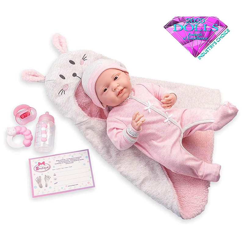 O recém-nascido é o presente perfeito para os mais pequenos da casa. O seu olhar sincero e cheio de alegria, o seu meio sorriso, e os seus mofletes rosa alegram e incitam a brincar com ela. Conjunto de presente: uma boneca de 38 cm vestida com um pêlo rosa e cinzento marmoreado, biberão, chupeta, chocalho, pulseira de hospital, certidão de nascimento e um cobertor quente e macio em forma de coelhinho muito simpático para que as crianças possam mimá-la e vesti-la. Pode mover facilmente todos os seus membros; braços, pernas e cabeça, para colocar e remover facilmente as roupas do pulso e criar todos os tipos de roupas. Segurança testada e aprovada: O pulso é feito de vinil macio, sem perfume e sem BPA. Pode ser colocado na água graças à alta qualidade dos materiais, a hora do banho já será uma diversão! Fabricado pela JC Toys, o único fabricante de bonecas com mais de 30 anos de experiência com bonecas realistas. Desenhado por Berenguer e pela equipa de design especializado.