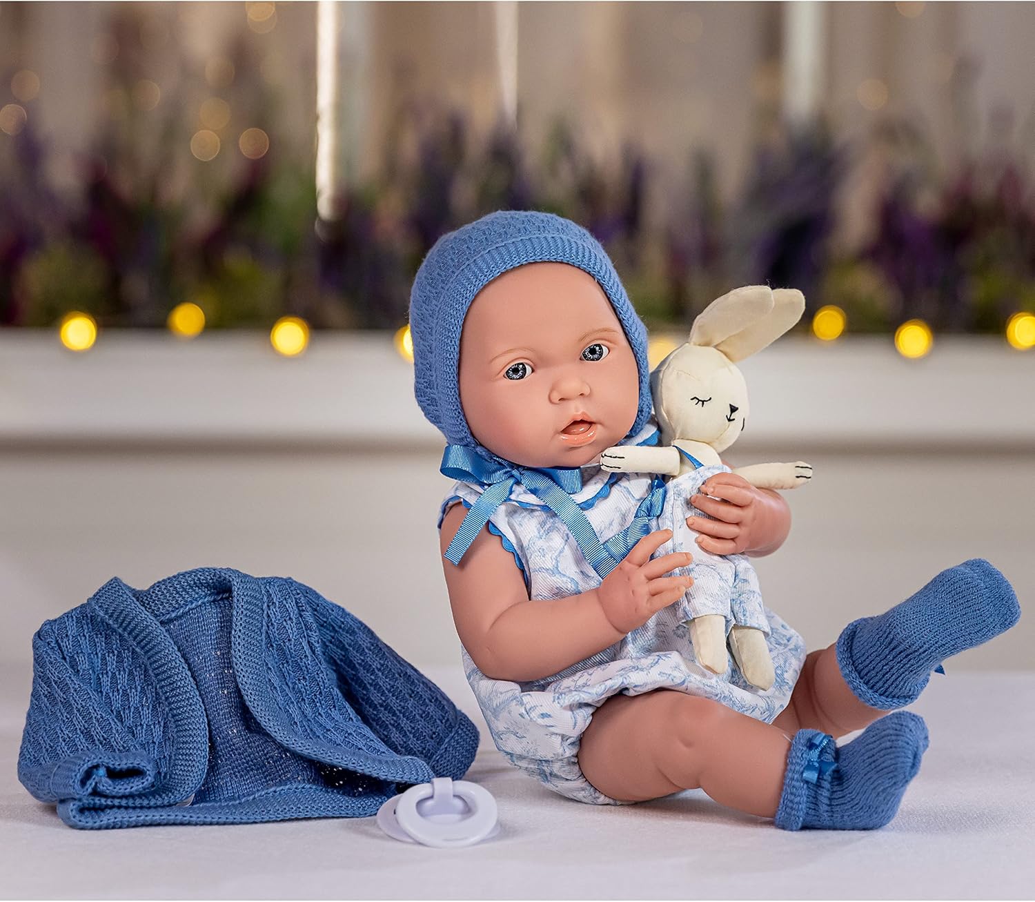 Que tal um passeio pela cidade? A coleção Royal Newborn, mostra todas as características de um bebé finamente detalhado, suas dobras, dedos, boca e olhos abertos, aparência suave, sobrancelhas e cabelos finamente esculpidos. Uma expressão realista faz com que pareça um bebé de verdade. Conjunto de presente: um boneco de 38 cm vestido com um conjunto em azul empoado com desenho de toile de jouy, blusão, peucos e gorro a condizer, chupeta e peluche com a mesma roupa que a Newborn. São adoráveis! O boneco pode ser movido com facilidade, graças às articulações dos braços, pernas e cabeça. É um boneco muito completo que desperta a imaginação dos mais pequenos. As crianças podem facilmente colocar e tirar as roupas do pulso e criar todos os tipos de roupas!