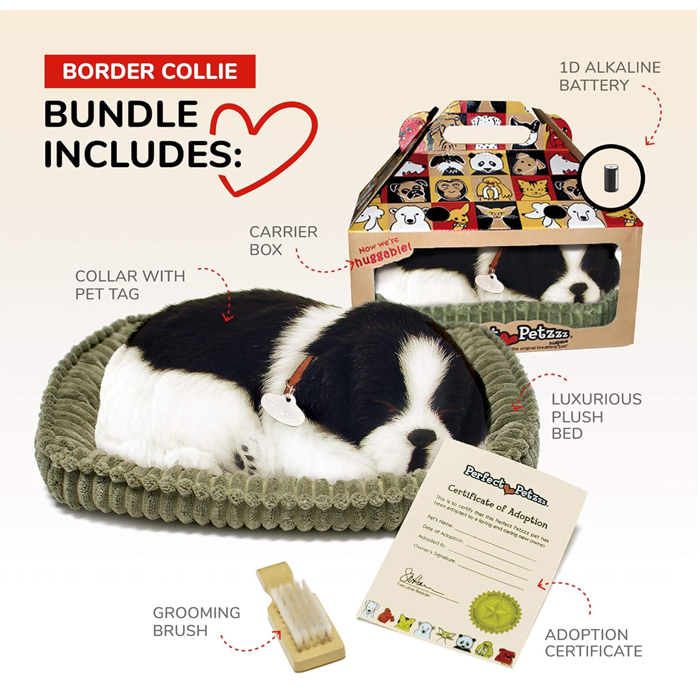 Apresentando o Border Collie - Pet Mate Nap Respirando Vida Como Cão Dormindo na Cama Sleeping Pet. Este Border Collie incrivelmente realista e adorável é o presente perfeito para os amantes de cães. Aconchegado em sua cama de luxo, este amigo peludo vai cativar seu coração. Nosso Border Collie é apresentado em uma caixa de presente atraente e até vem com um certificado de adoção.