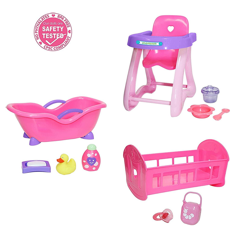 Agora cuidar da boneca é muito mais simples e divertido! O conjunto completo de 3 acessórios: banheira, cadeira alta para comer e berço de balanço é perfeito para brincar com as bonecas. Agora sim. A diversão está garantida!