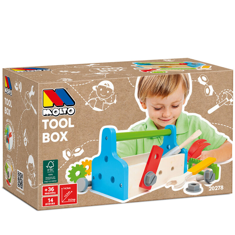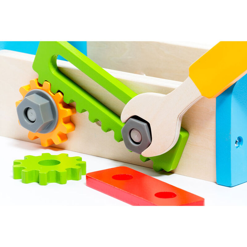 Idade: +36 meses. Tamanho: 16x15x26cm. Caixa de ferramentas de brinquedo de madeira com todos os tipos de acessórios, porcas, parafusos, martelo, chave de fenda e chave inglesa com a qual você pode parafusar, desaparafusar, inserir e remover as peças.