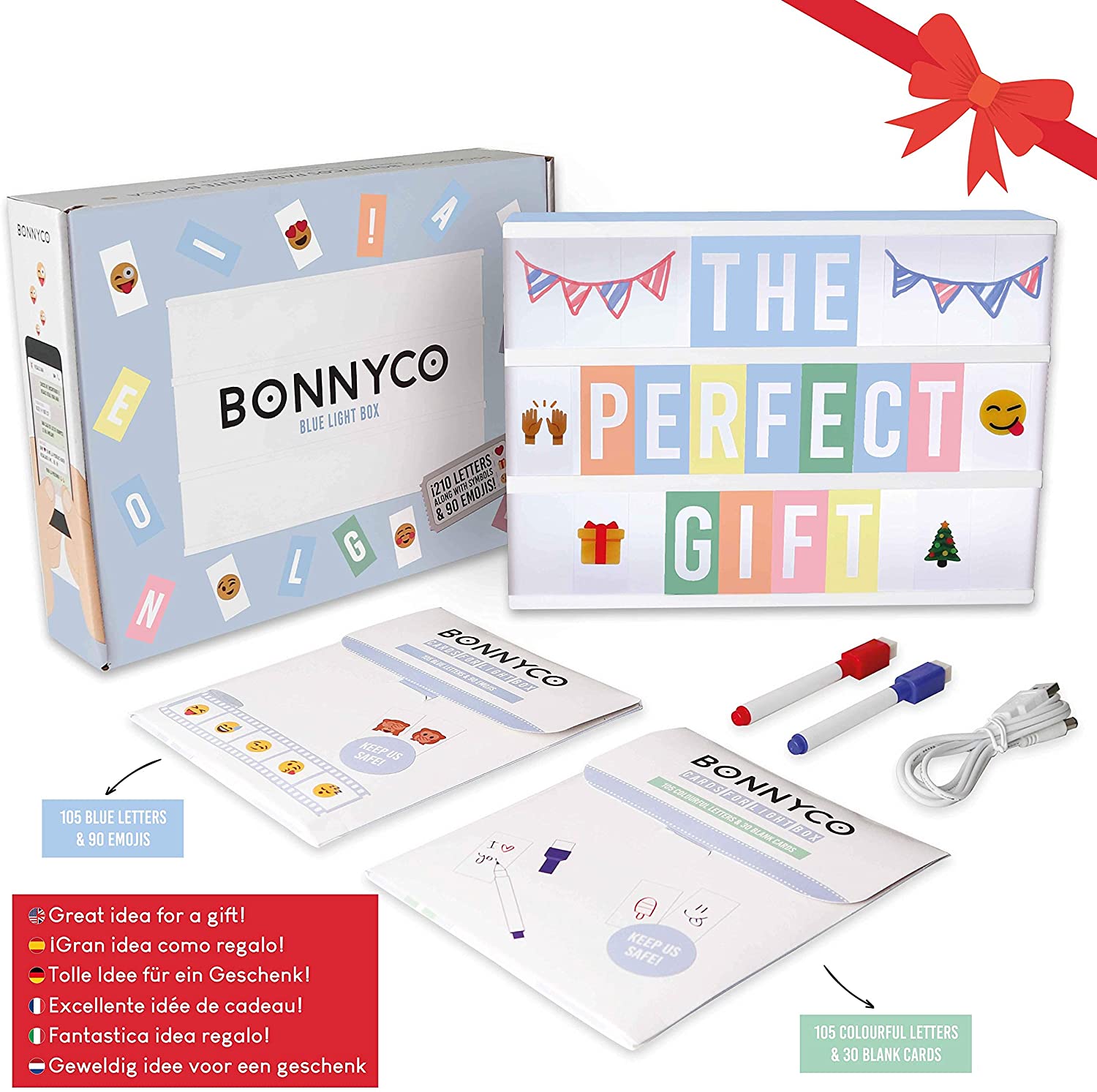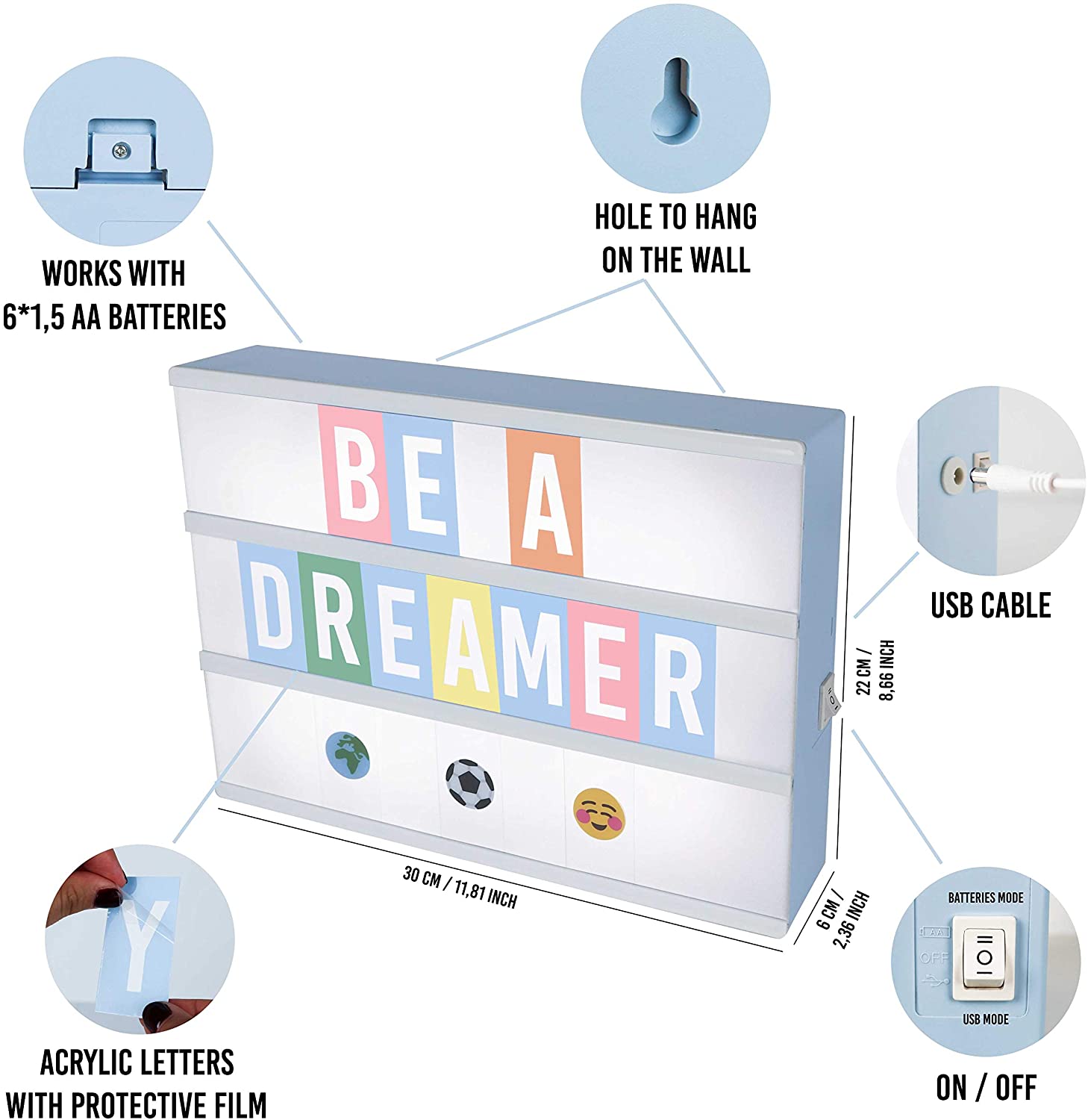 Com 210 letras e 90 emojis dobrável: com 105 letras com fundo cor-de-rosa e 105 letras com fundo colorido, tudo o que necessita para criar frases e colocar citações com as letras Ñ e Ç também incluídas. Além disso, esta caixa de luz contém 90 emoticons coloridos e divertidos. Cabem até 10 cartões em cada fila, ao contrário dos 8 a 9 que cabem nas outras.