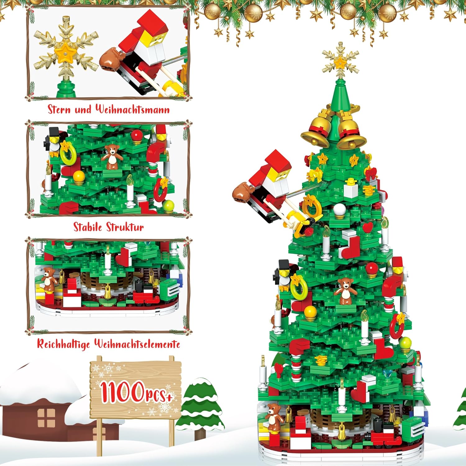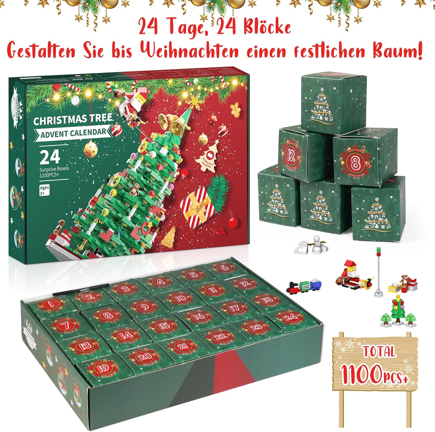 Calendário de advento 2024 crianças: O conjunto de blocos de árvore de Natal para crianças do calendário do advento 2024 contém aprox. 1100 blocos pequenos. Todo o conjunto de calendário do advento pode ser montado como 2 árvores de Natal pequenas ou como 1 árvore de Natal grande. Este conjunto de presente de calendário de advento para crianças contém uma variedade de diferentes elementos de Natal que são ótimos, divertidos e adorados pelas crianças.