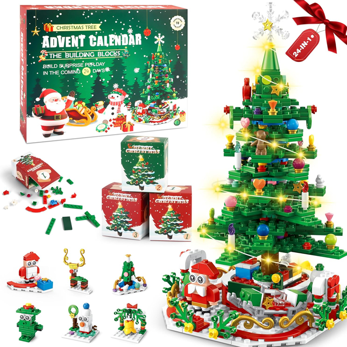 Calendário advento de 24 dias árvore de Natal 2025 com surpresas - este calendário do advento com blocos de construção em forma de árvore de Natal contém 24 caixas surpresa numeradas. De 1 a 24 de dezembro, cada dia poderá abrir uma nova caixa e receberá um novo modelo em miniatura relacionado ao Natal para montar, que após 24 dias será combinado para formar uma grande árvore de Natal