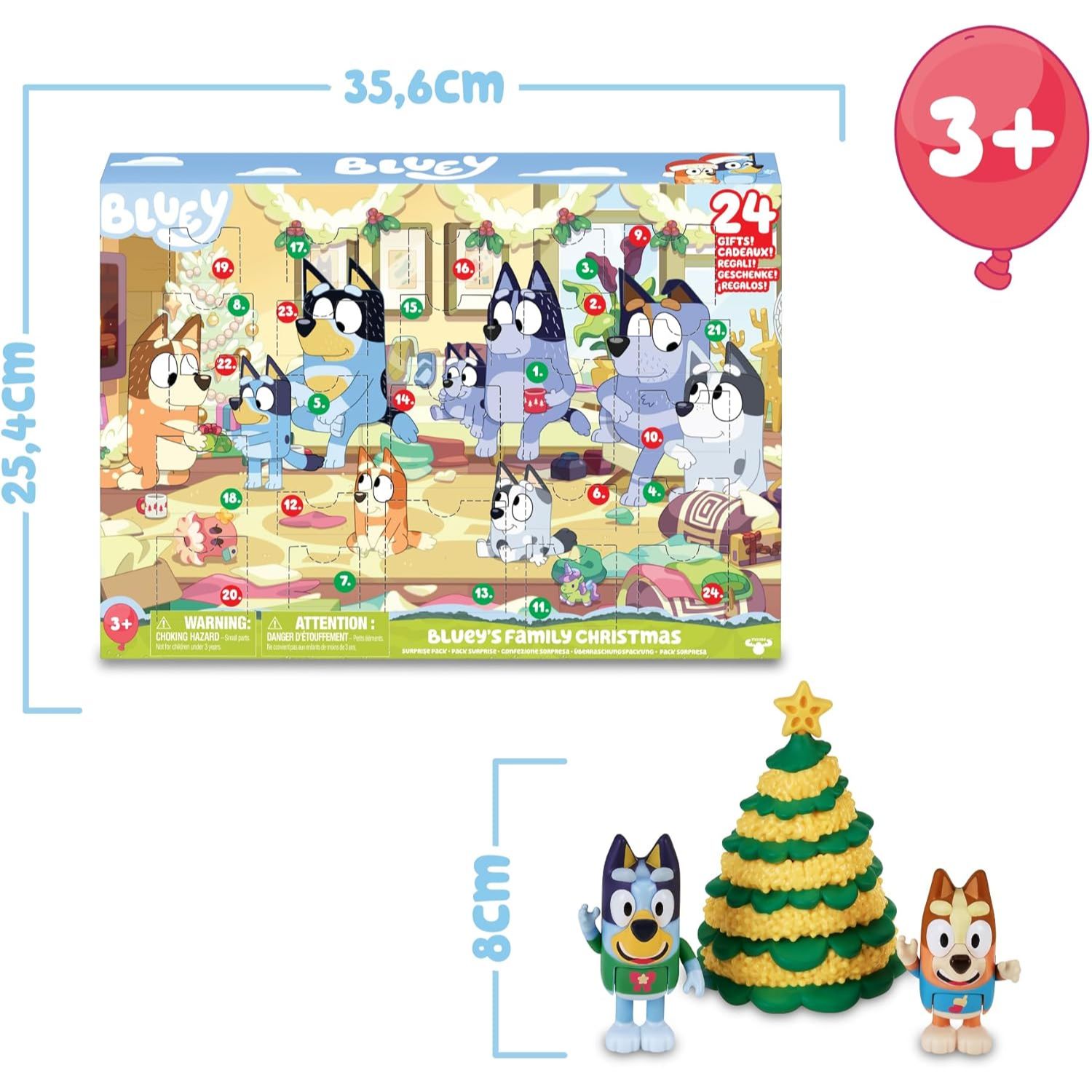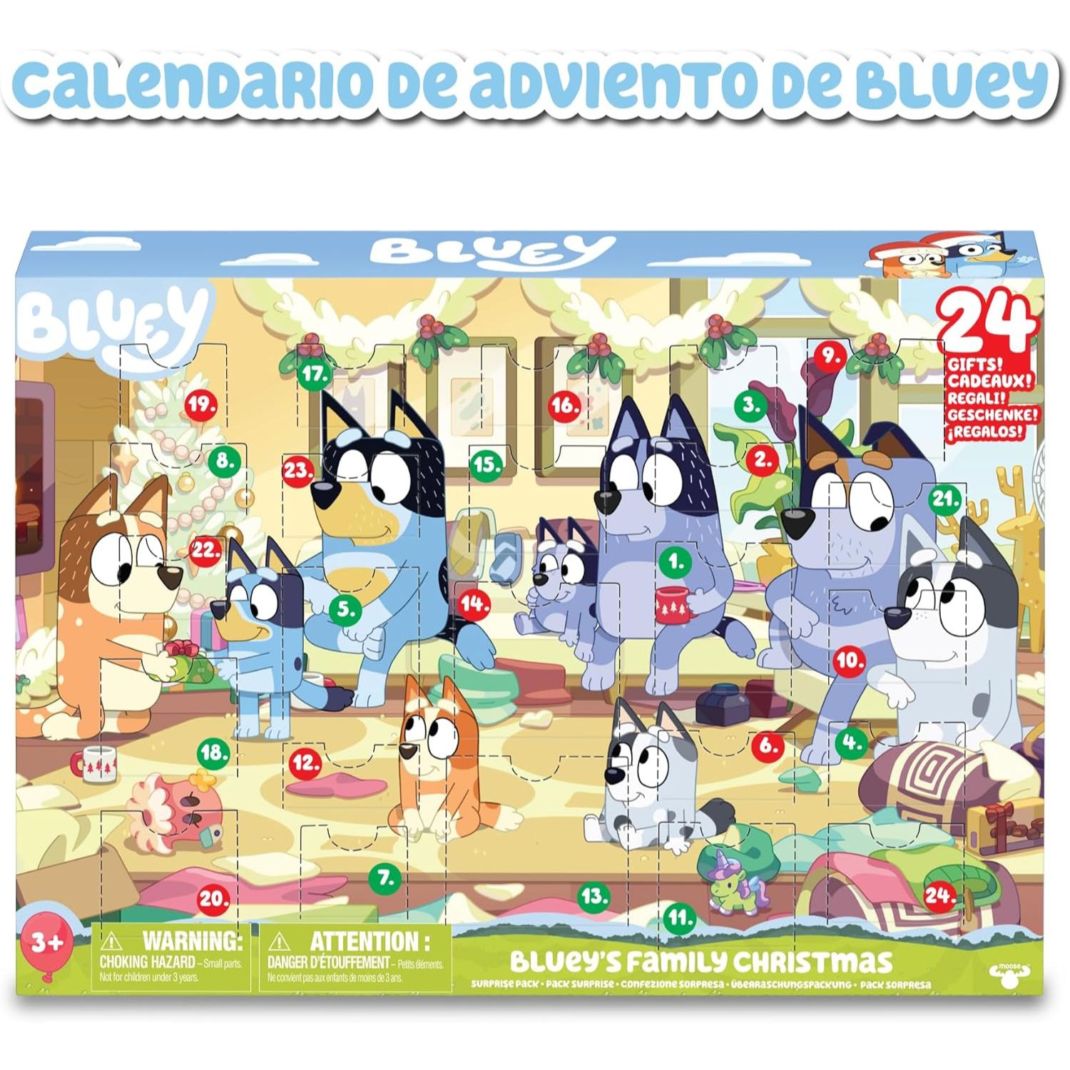 Calendário de advento de Bluey, com 24 compartimentos para descobrir e colecionar figuras e acessórios da série infantil de desenhos animados
