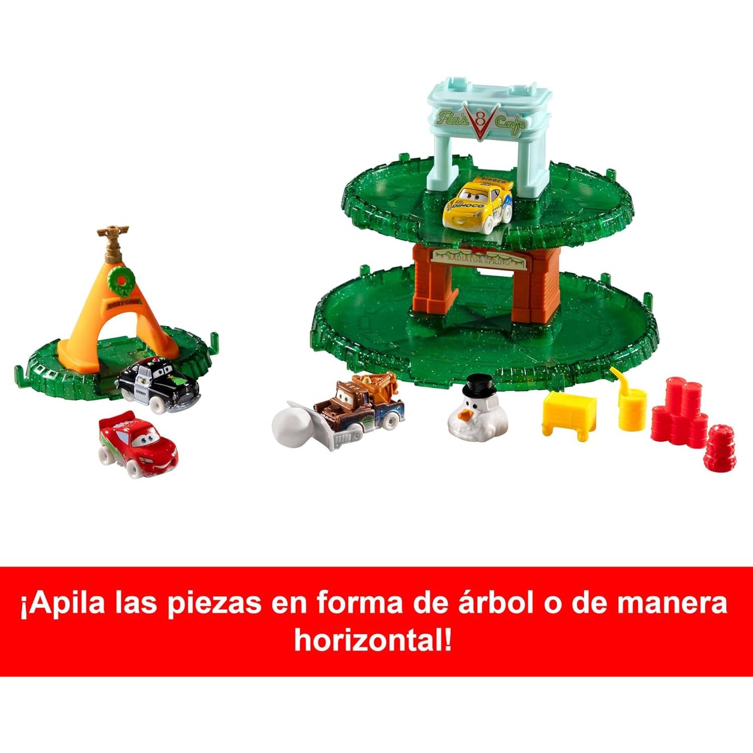 Os miniveículos incluídos são Raio McQueen, Cruz Ramirez, Xerife e Mate, que possui um acessório de limpa-neves e uma bola de neve gigante para remover.