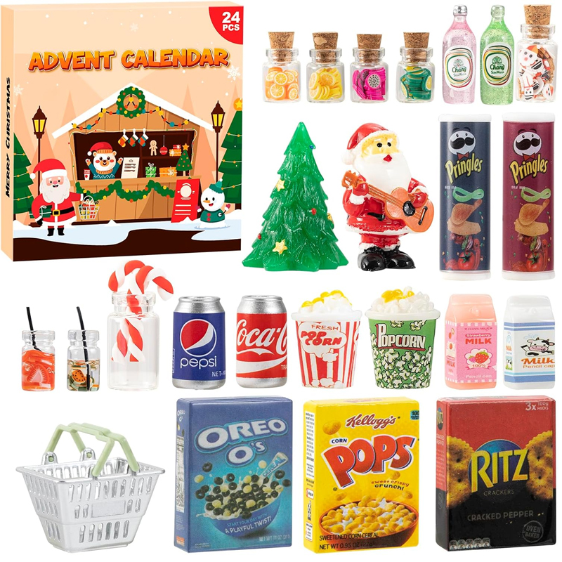 24 dias de surpresa - conta regressiva para o Natal: o calendário do advento usa 24 portas únicas para que sinta a magia desta estação, cada uma com uma deliciosa surpresa. Este calendário advento brinquedos gera antecipação e alegria em crianças e famílias durante todo o dezembro, até o Natal. Ampla variedade de alimentos clássicos: por trás de cada porta do calendário do advento das crianças, descubra uma réplica de comida não comestível de grande realismo. O conjunto de comida miniatura inclui uma variedade de modelos populares de alimentos, como uma cesta de compras*1, uma árvore de Natal * 1, 2 batatas fritas * 2, 2 bebidas*2, 2 pipoca * 2, 2 leites*2, 3 lanches*3, 1 Pai Natal x 1, 2 bebidas de frutas x 2, 2 dultos CES x 2, 4 4 rodelas de frutas e 2 refrigerantes de cola! Ideal para jogos de role, como cozinha e casa de bonecas.