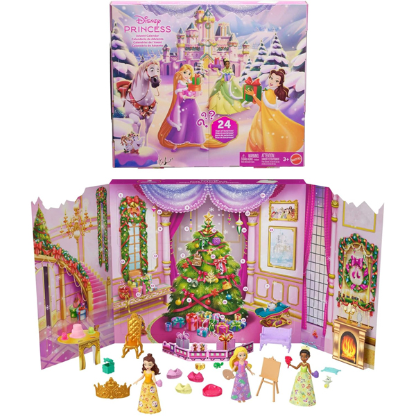Faça a contagem regressiva para o Natal com bonecas, roupas, móveis, figuras de animais e muito mais do calendário do advento da Disney Princesas. Os meninos e as meninas vão adorar mergulhar no espírito natalício com 24 dias deslumbrantes de presentes: uma surpresa especial que abrirão todos os dias! Os presentes incluem três pequenas bonecas de princesas Disney (8,89 cm), bela, tiana e Rapunzel, com saias e capas de inverno de tirar e colocar com tema de Natal. O calendário também inclui três adoráveis figuras de animais: Pascal de 'Enredados', Lumière da 'A Bela e a Fera', e Ray de 'Tiana e o Sapo'. A caixa torna-se um cenário festivo de inverno para brincar e expor surpresas, e também contém peças adicionais que se destacam, como uma lareira e uma mesa.
