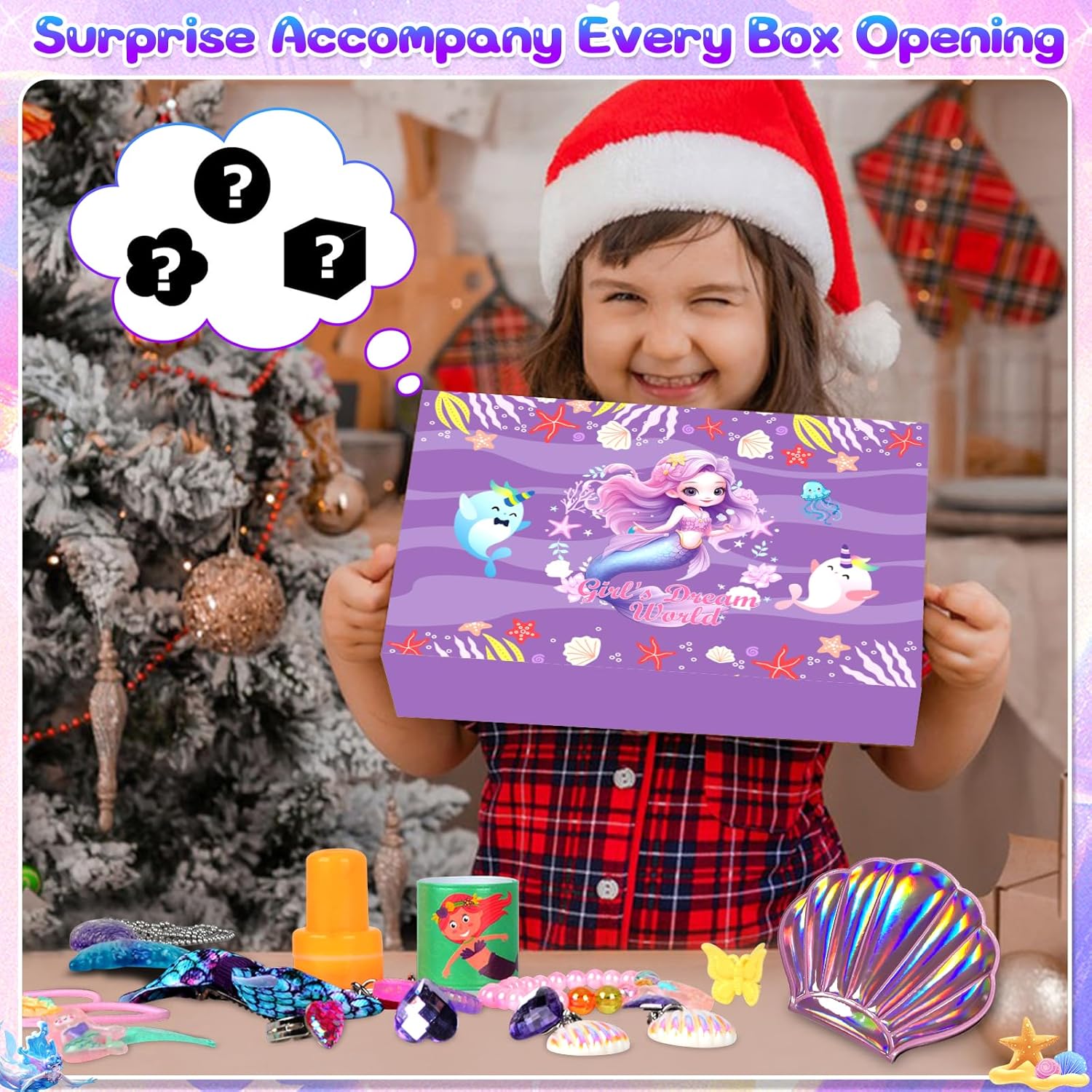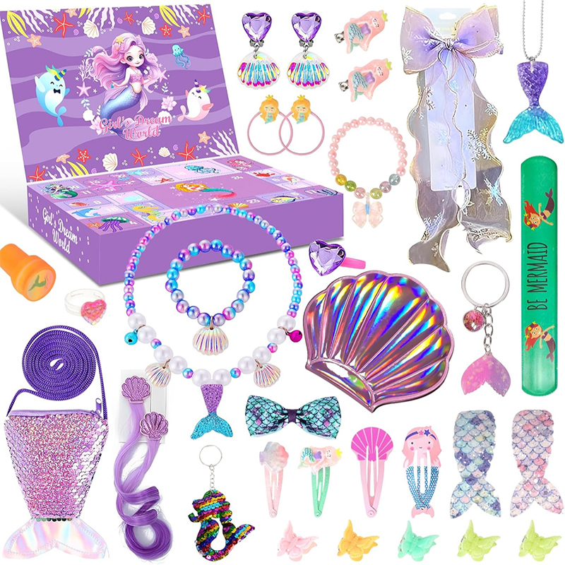 Presentes de Natal de sereias: a nossa caixa de presentes para meninas com calendário de advento de sereia 2024 contém 24 peças de pequenos presentes, incluindo ganchos de cabelo, colares, pulseiras, espelho, bolsa de sereia, chaveiros, brincos, anéis, perucas, selos, fitas para o cabelo, etc.
