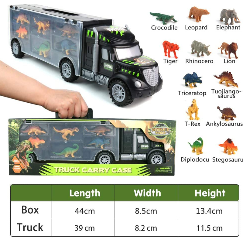 Camião de transporte de dinossauros com 12 figuras de animais. O tamanho do camião de brinquedo é de aproximadamente: 39 cm x 8,5 cm x 12 cm. Inclui as seguintes figuras: 6 dinossauros, 1 elefante, 1 crocodilo, 1 urso, 1 leão, 1 rinoceronte e 1 tigre.