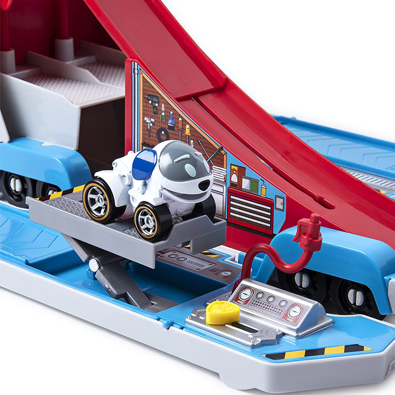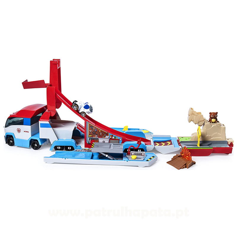Abre e transforma o Paw Patroller numa pista cheia de ação e missões: apaga o fogo, ajusta o Robodog e o ajuda o urso que está preso nas pedras! Tem capacidade para guardar até 7 veículos.