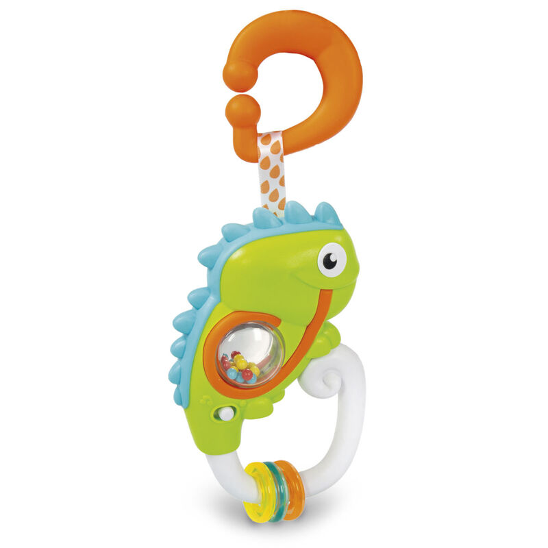 Idade: +3 meses. Este divertido sonajero con forma de camaleón se convertirá en el pasatiempo preferido del niño. Al agitar el sonajero se activan entretenidas melodías y efectos sonoros, mientras que las bolas que hay en la tripita del camaleón y los colgantes de colores atraerán la atención del niño estimulando su percepción táctil.
