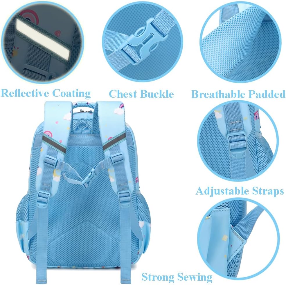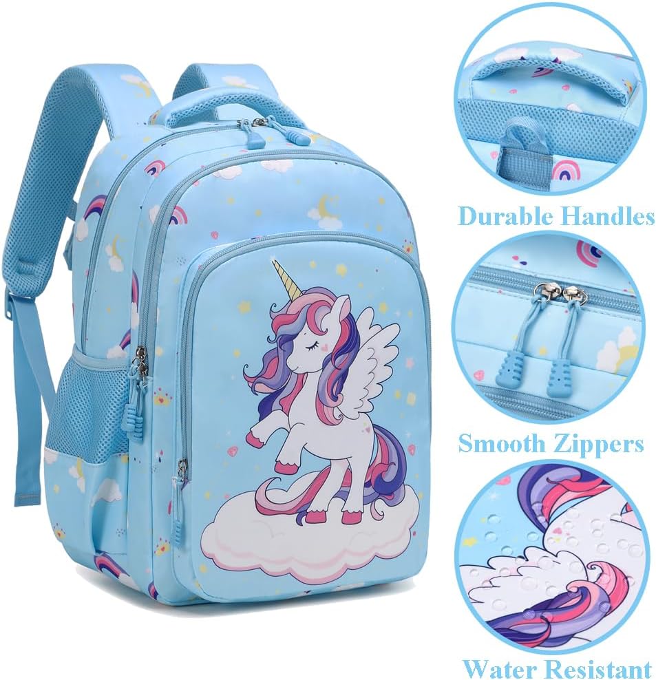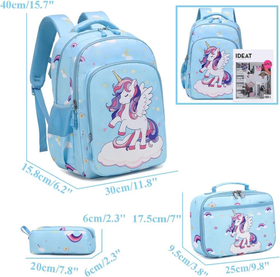 Grande capacidade: O tamanho da mochila escolar é de 30 x 15,8 x 40 cm, cerca de 15 litros. Lancheira: 25 x 9,5 x 17,5 cm. Estojo para lápis: 20 x 6 x 6 cm. A mochila unicórnio escolar possui vários bolsos e fechos de correr lisos SBS, proporcionando espaço suficiente para colocar livros de estudantes, laptop, ipad, garrafas de água, livros didáticos e artigos de papelaria.