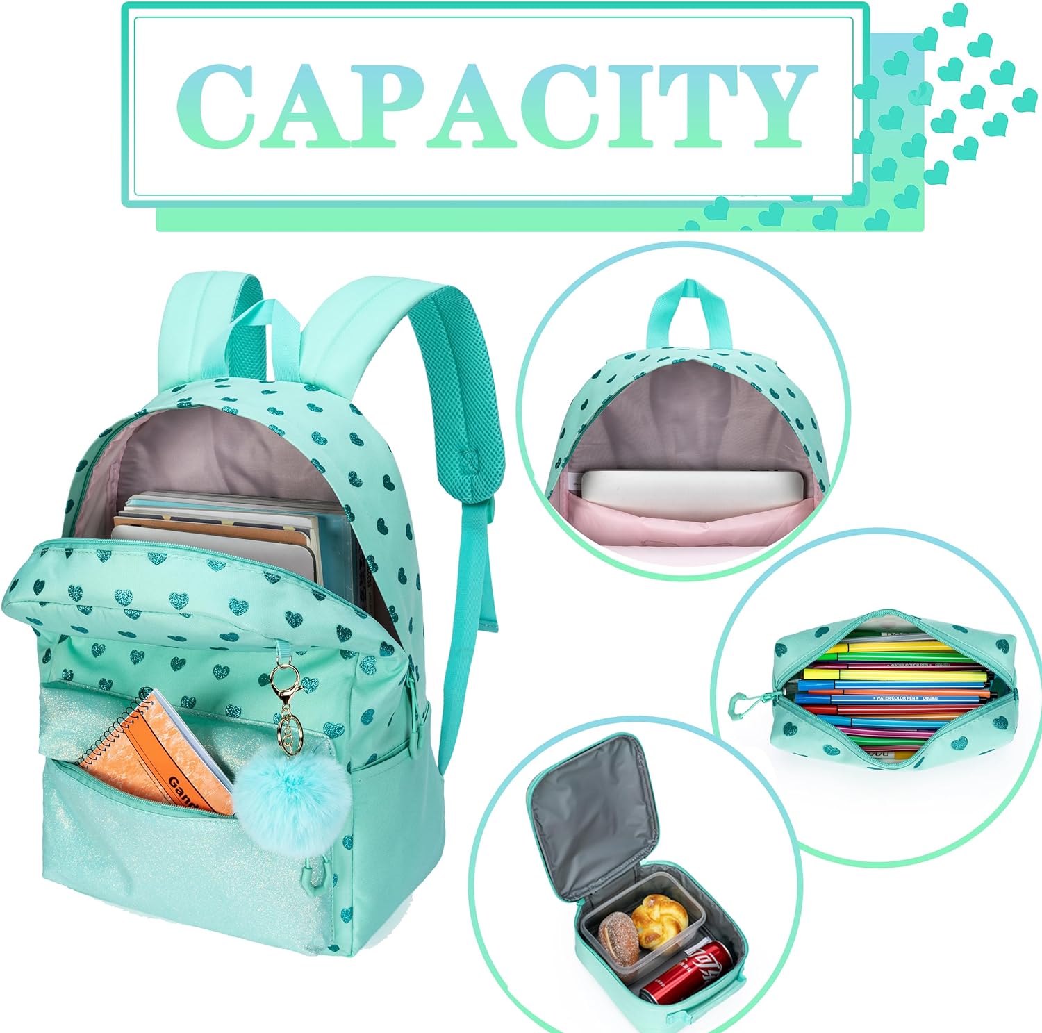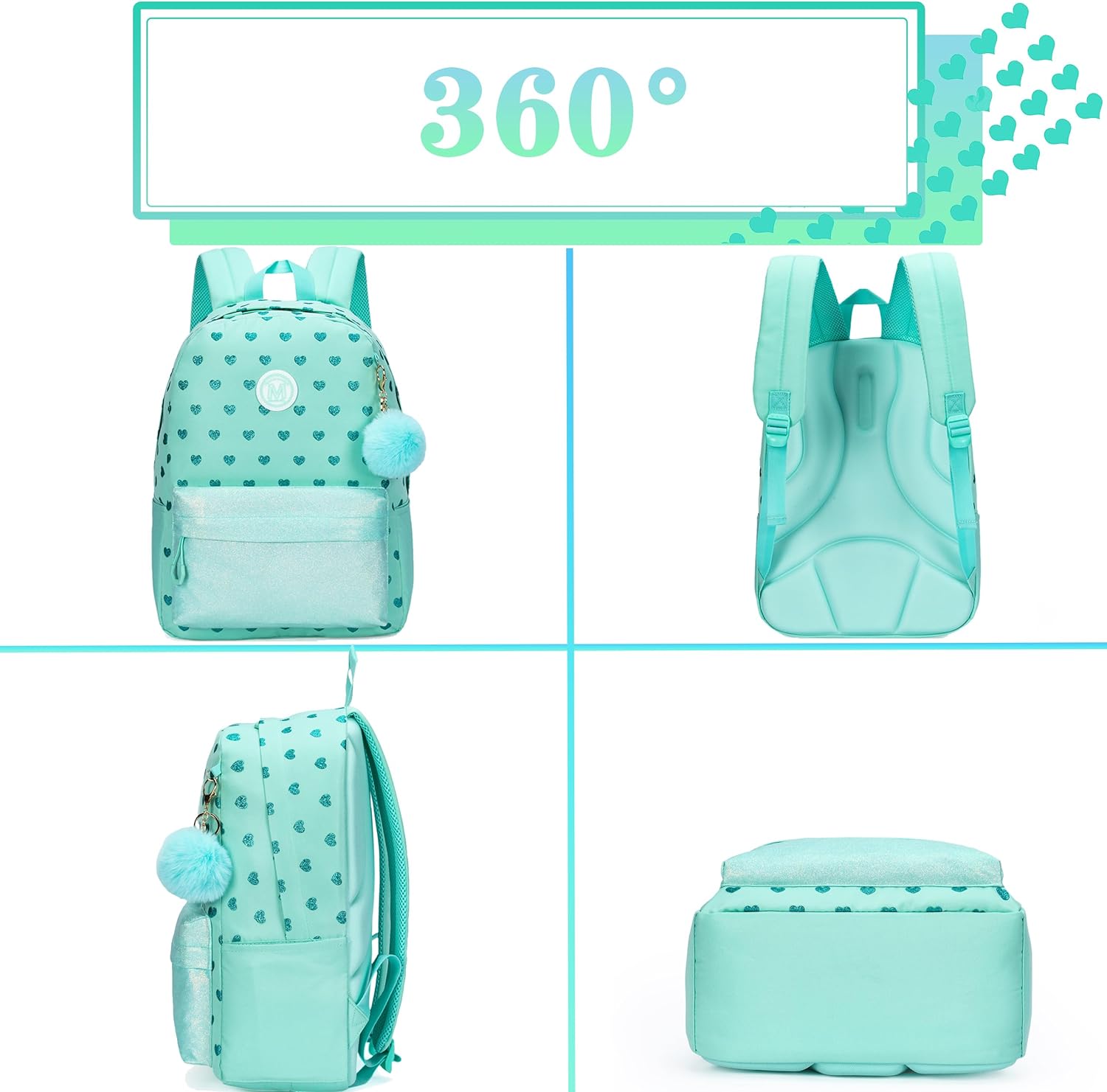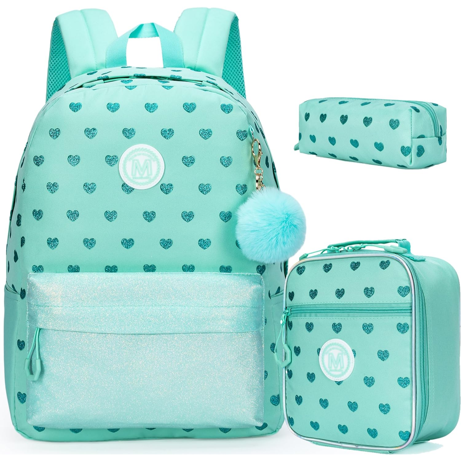 Conjunto Escolar Corações Verde água - Mochila Escolar + Lancheira + Porta-lápis