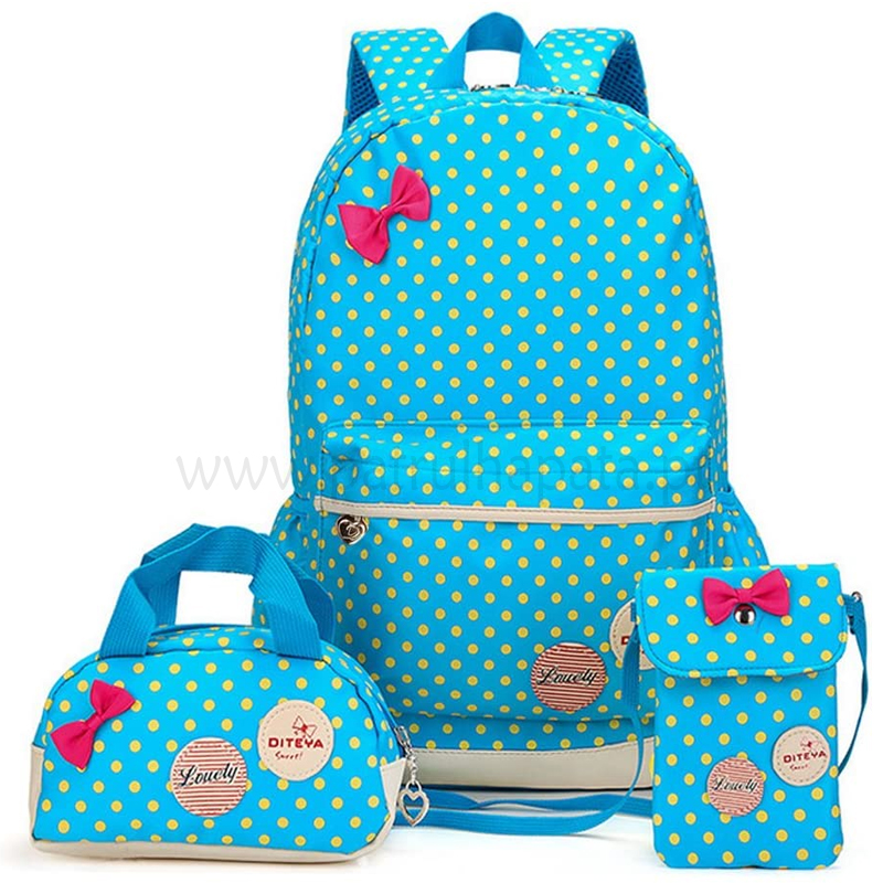 A mochila escolar tem 2 bolsos principais com fecho de correr. No compartimento interior cabe um computador de 15 polegadas. Dois dos bolsos laterais podem transportar uma garrafa de água e um guarda-chuva; a pequena bolsa e a mini bolsa de ombro podem ser usadas como carteira ou colocar a chave, o cartão ou o telemóvel, de acordo com as suas necessidades.
