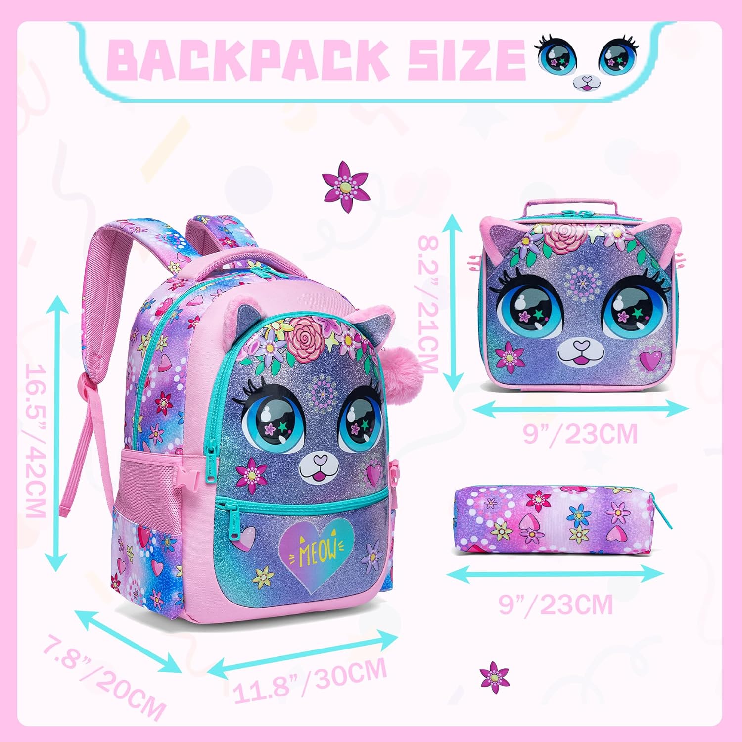 Mochila de menina: 42 x 30 x 20 cm, lancheira de almoço: 23 x 20 cm, estojo para lápis: 23 cm. Esta mochila atenderá às necessidades diárias da escola dos seus filhos. Design: alças largas e espessas, design de malha e esponja, absorve a humidade, respirável, alças acolchoadas para maior suporte e conforto durante as atividades diárias. Capacidade: o bolso principal da mochila escolar para menina do ensino básico pode acomodar livros didáticos ou cadernos, pequeno bolso frontal com porta-canetas para guardar pequenos objetos com segurança, 2 bolsos laterais de malha para garrafa de água ou guarda-chuva. 1 estojo para lápis e 1 lancheira ajustável.