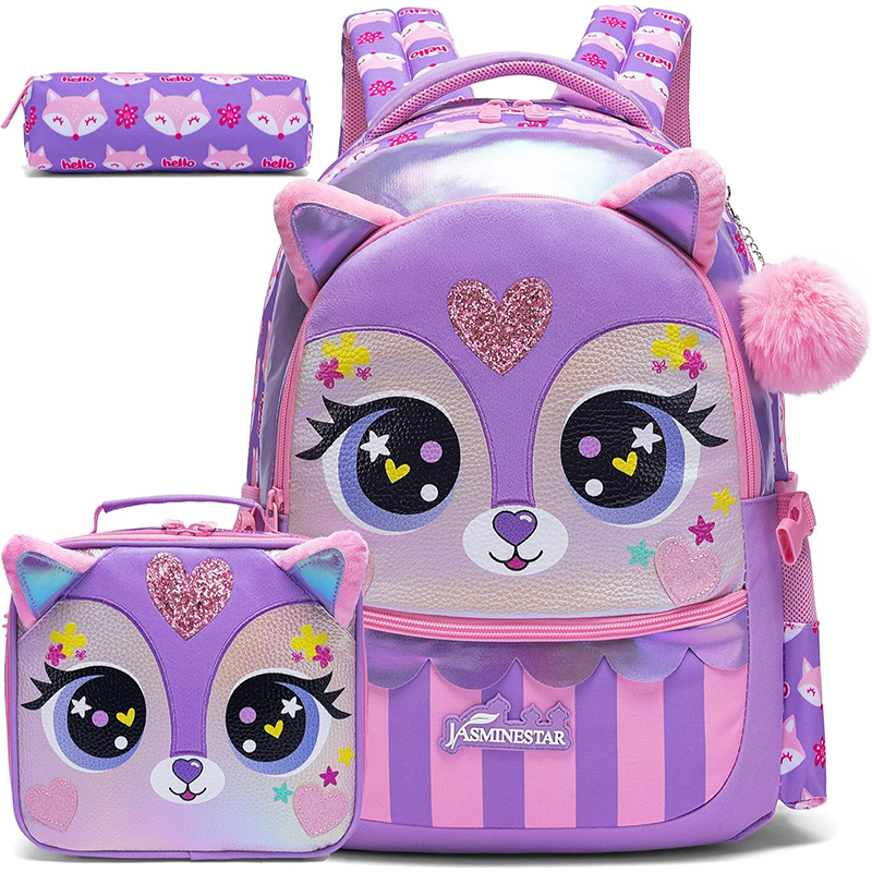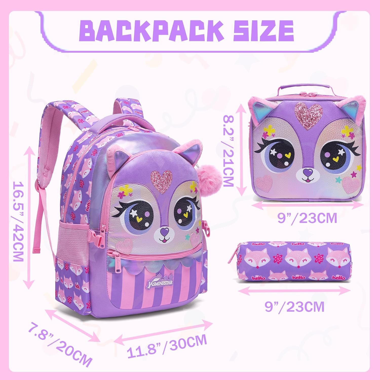 Mochila de menina: 42 x 30 x 20 cm, lancheira de almoço: 23 x 20 cm, estojo para lápis: 23 cm. Esta mochila atenderá às necessidades diárias da escola dos seus filhos. Design: alças largas e espessas, design de malha e esponja, absorve a humidade, respirável, alças acolchoadas para maior suporte e conforto durante as atividades diárias. Capacidade: o bolso principal da mochila escolar para menina do ensino básico pode acomodar livros didáticos ou cadernos, pequeno bolso frontal com porta-canetas para guardar pequenos objetos com segurança, 2 bolsos laterais de malha para garrafa de água ou guarda-chuva. 1 estojo para lápis e 1 lancheira ajustável.