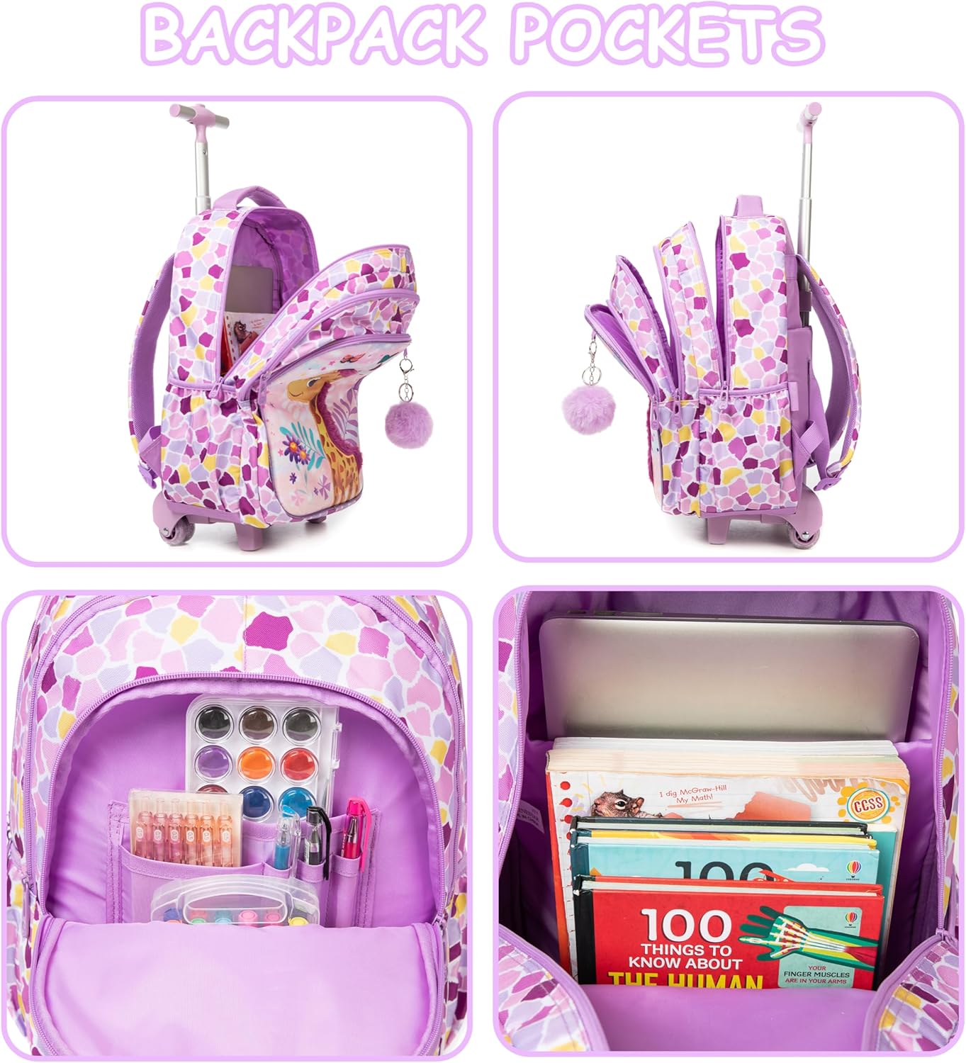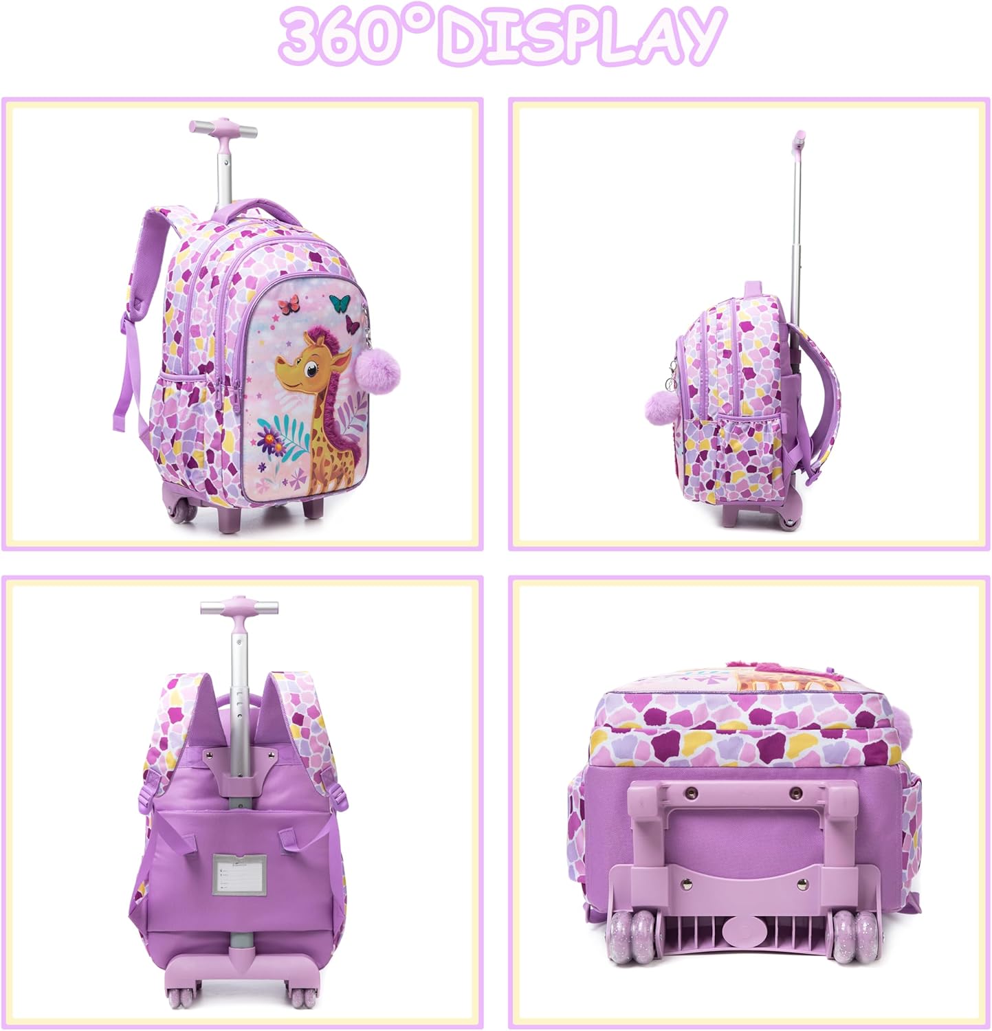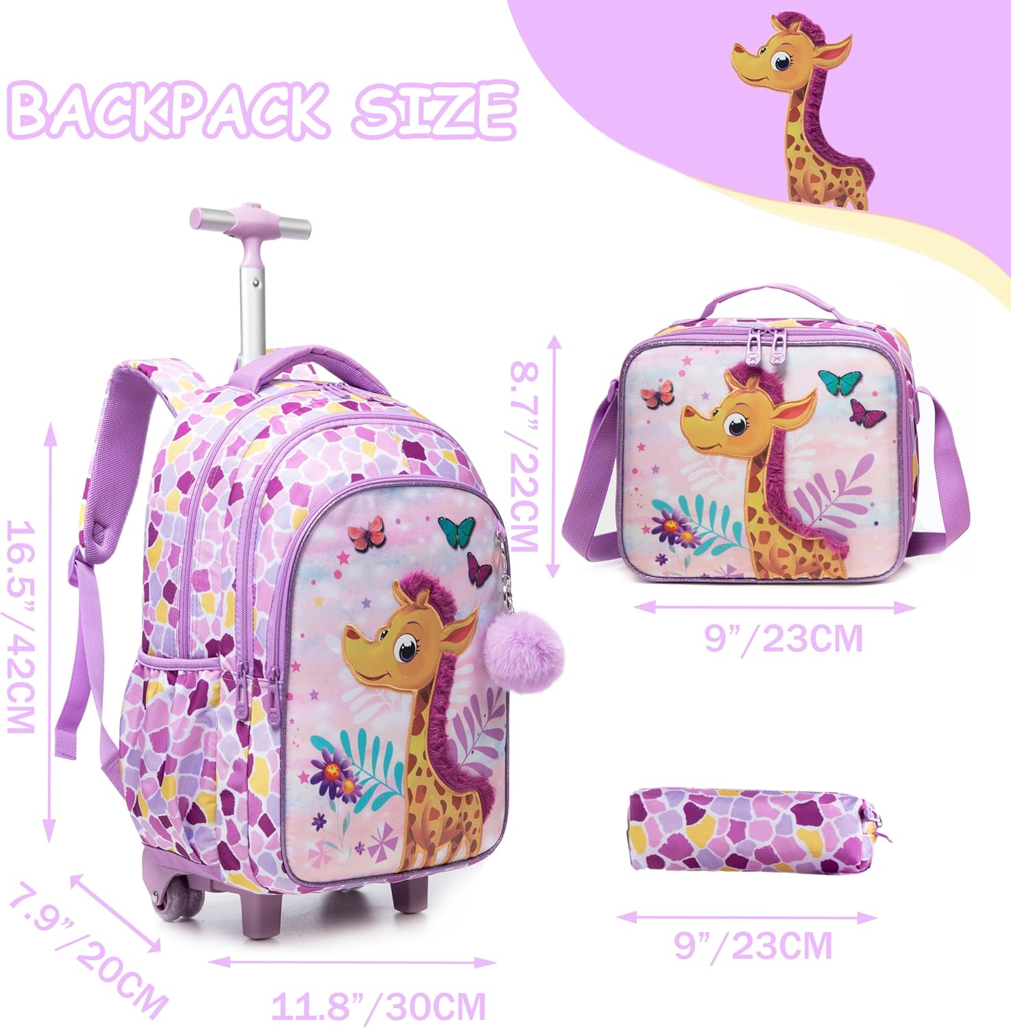 Dimensões: Mochila rodas menina: 43 cm x 30 cm x 20 cm, lancheira de almoço: 23 cm x 20 cm, estojo para lápis: 23 cm. A mochila com rodas satisfará os seus filhos quando carregarem o material escolar diário. Grande capacidade: Mochila com rodas menina com grandes compartimentos e bolsos, a mochila escolar para meninas do ensino básico pode organizar livros, computadores, guarda-chuvas, garrafas de água, artigos de papelaria e muito mais. Material: o design silencioso de 2 rodas com haste de liga de alumínio de alta resistência não só garante que possa girá-lo suavemente e seja resistente ao desgaste, mas também o torna fácil e natural.