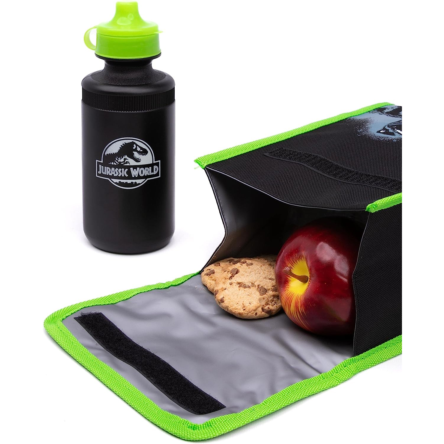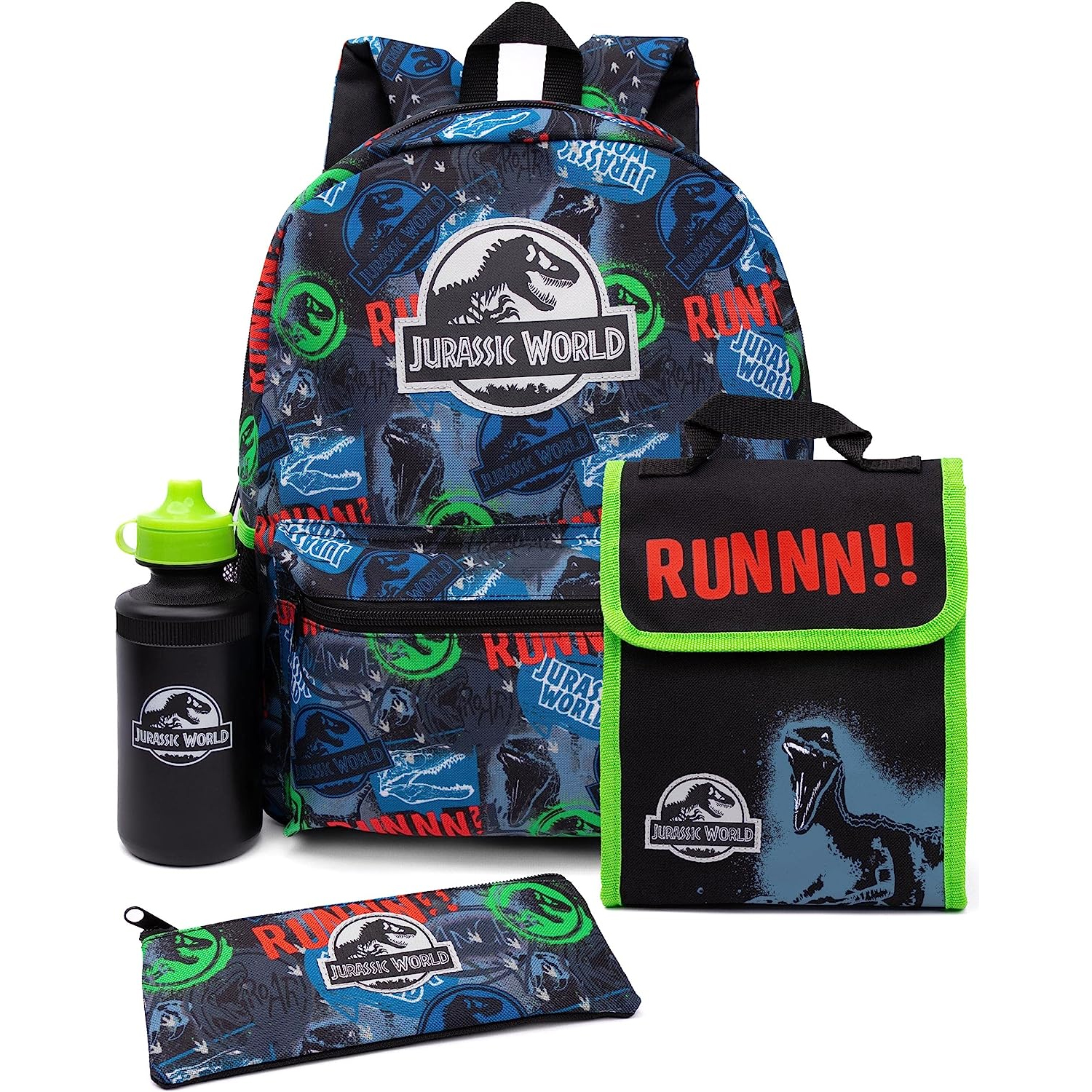 Jurassic World 4 peças School mochila Set para crianças - inclui um T-Rex, logótipo e sinais de aviso impressão mochila, lancheira, caixa de lápis e garrafa de água. É a melhor maneira de qualquer ventilador de dinossauros transportar os seus itens essenciais do dia a dia, o almoço da escola, os artigos de papelaria e os doces com estilo.