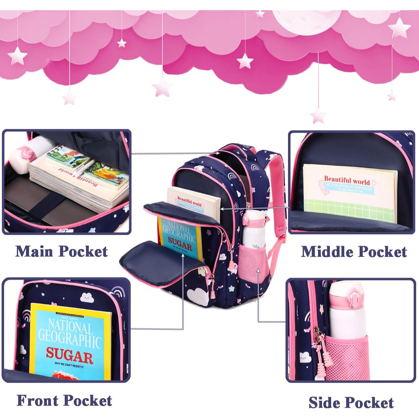 Fácil de organizar - esta mochila para meninas tem 3 * bolsos, 2 * bolsos laterais e bolso principal com muitos compartimentos para o material escolar das crianças.