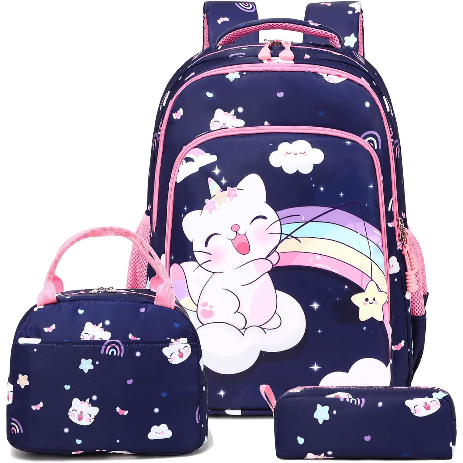 Conjunto Escolar - Mochila + lancheira térmica + porta-lápis - Gatinha Azul