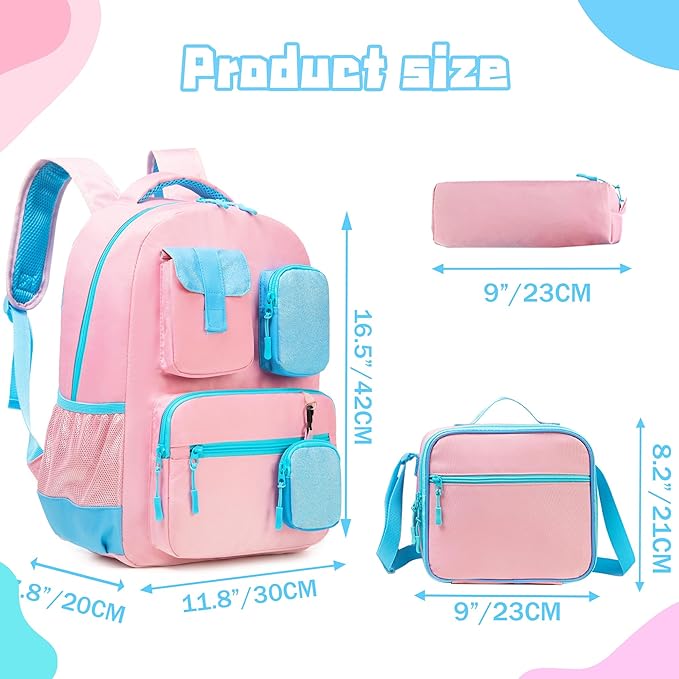 Mochilas escolares: 42 x 30 x 20 cm, lancheira de 23 x 21 cm. estojo para lápis: 23 cm.