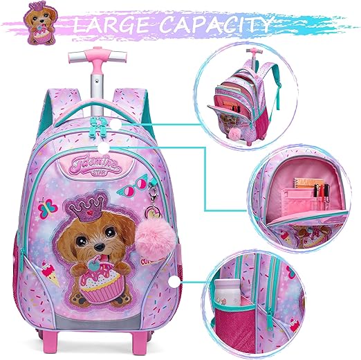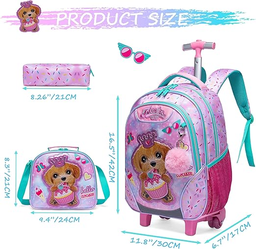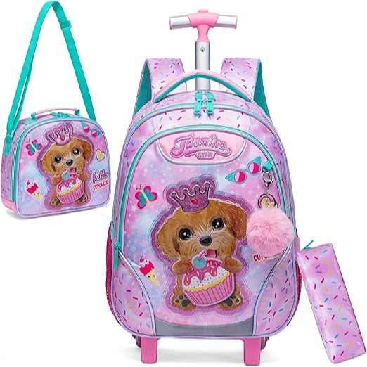 Dimensões: Mochila rodas menina: 43 cm x 30 cm x 20 cm, lancheira de almoço: 23 cm x 20 cm, estojo para lápis: 23 cm. A mochila com rodas satisfará os seus filhos quando carregarem o material escolar diário. Grande capacidade: Mochila com rodas menina com grandes compartimentos e bolsos, a mochila escolar para meninas do ensino básico pode organizar livros, computadores, guarda-chuvas, garrafas de água, artigos de papelaria e muito mais. Material: o design silencioso de 2 rodas com haste de liga de alumínio de alta resistência não só garante que possa girá-lo suavemente e seja resistente ao desgaste, mas também o torna fácil e natural.
