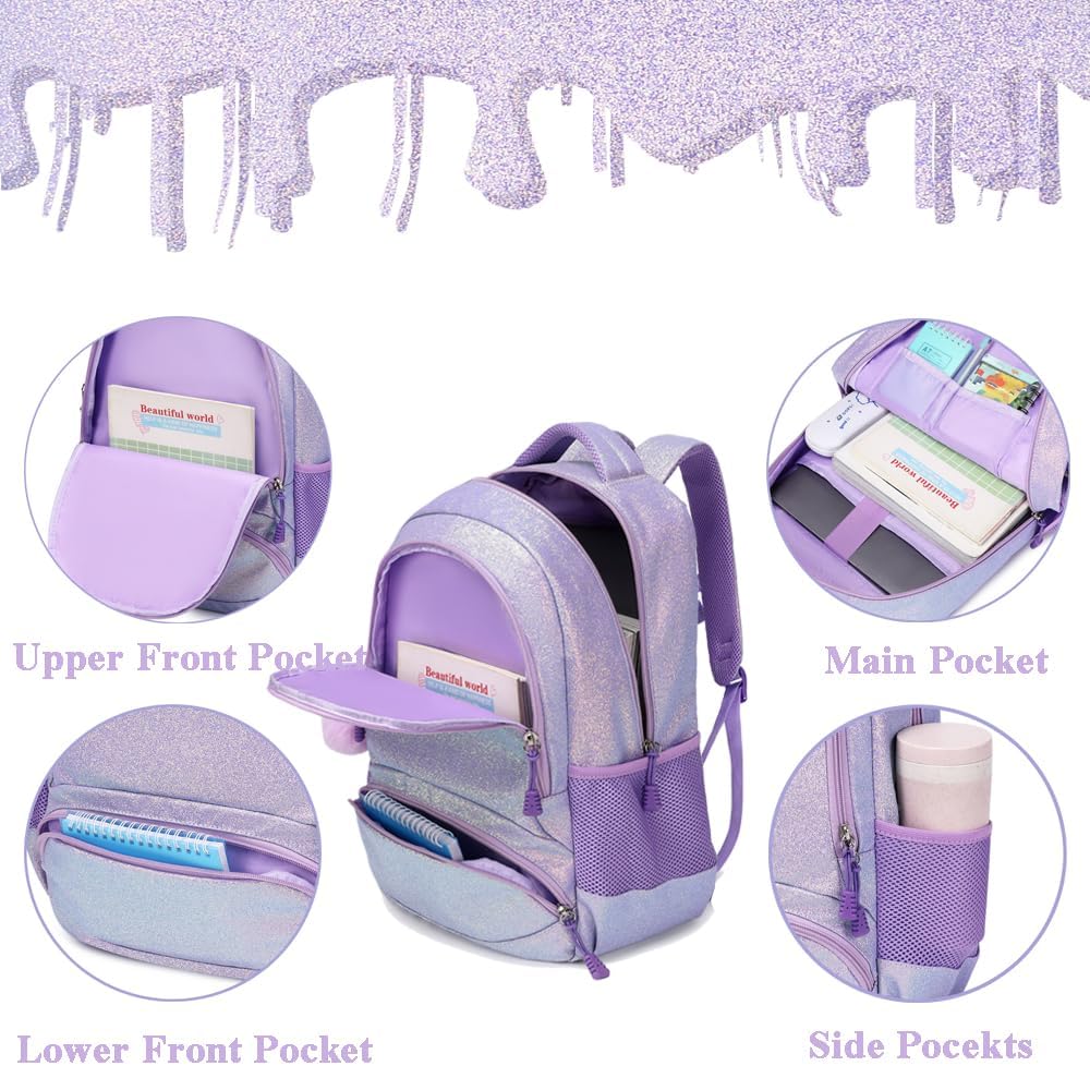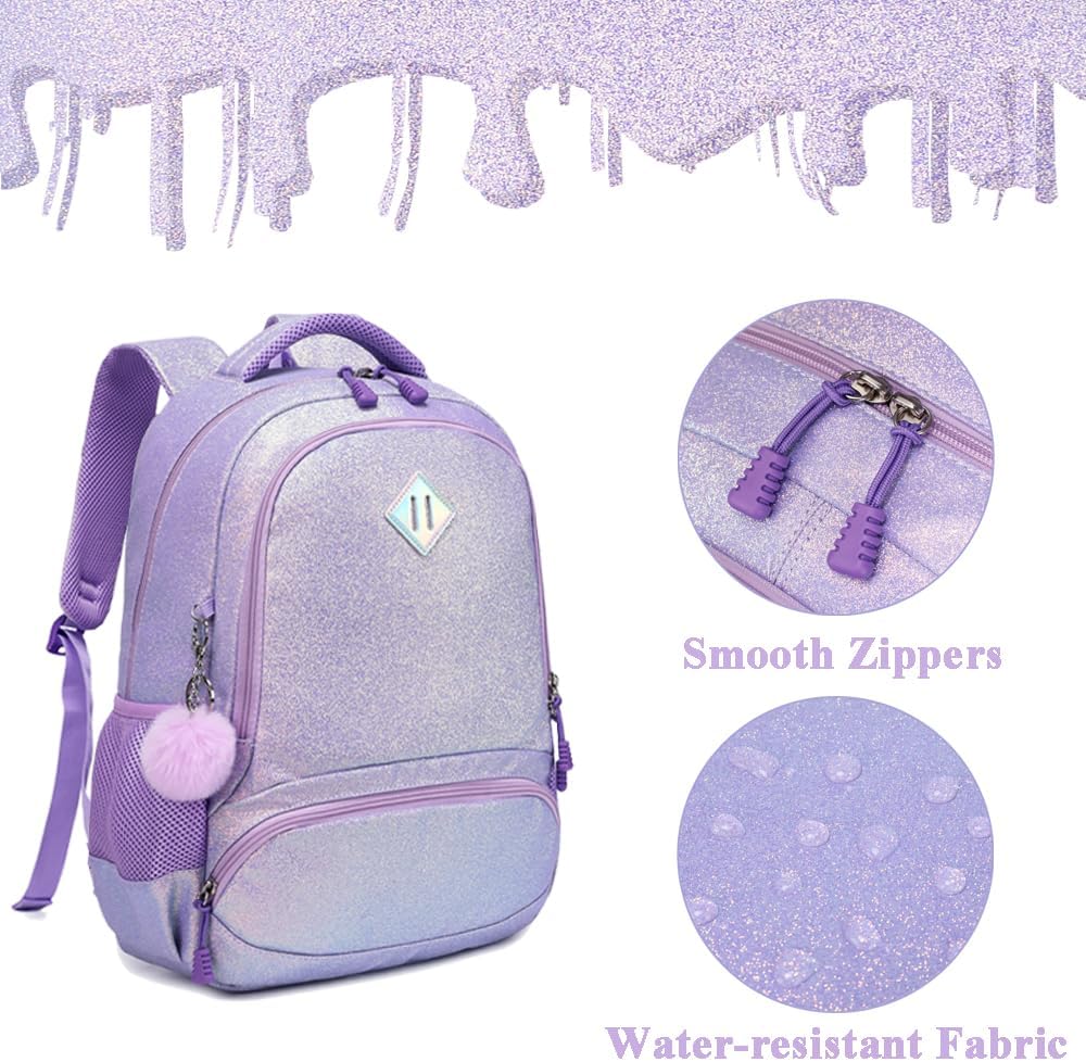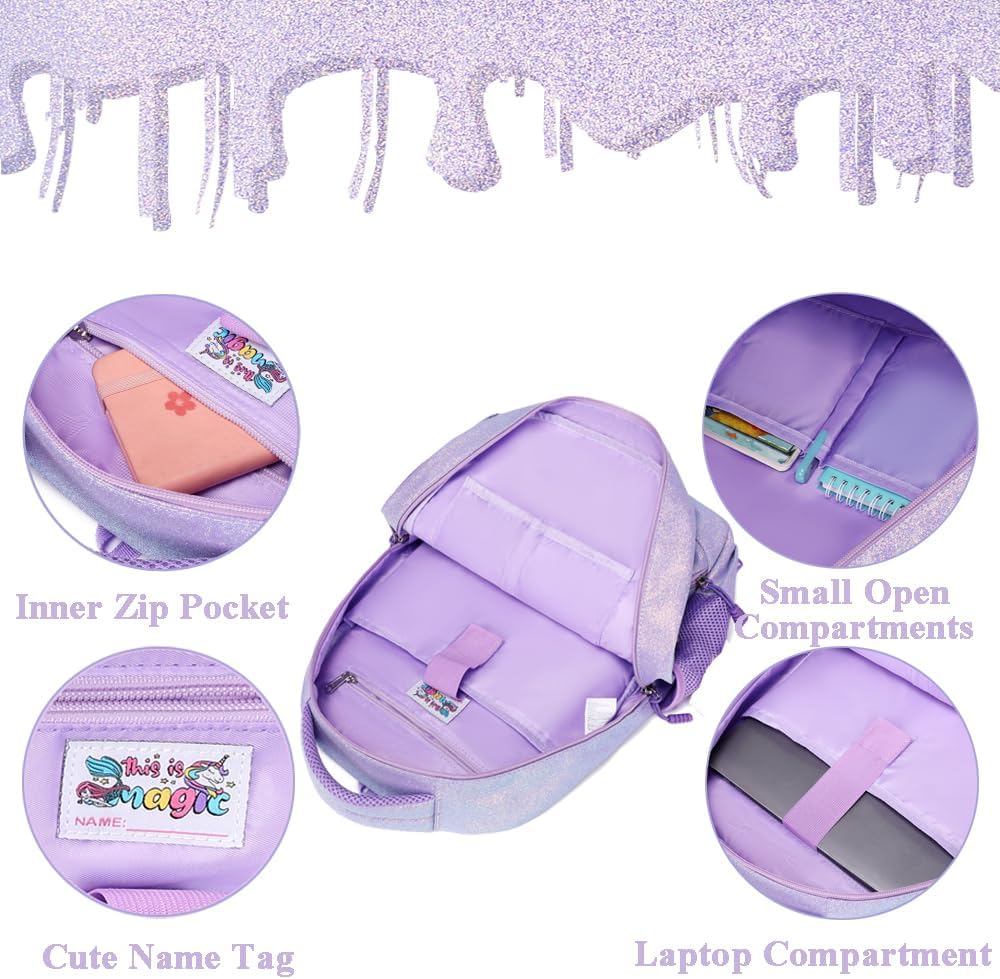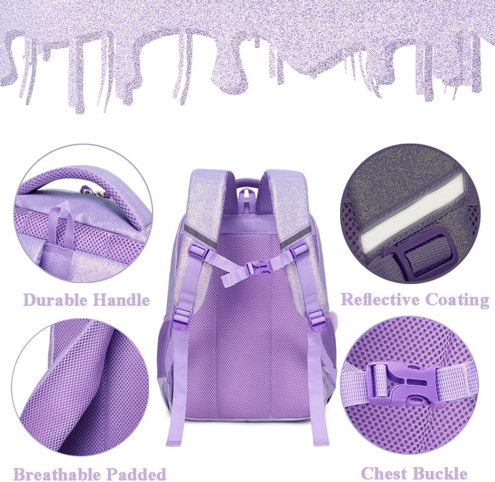 Mochila com vários compartimentos: esta mochila purpurina para meninas tem 1 compartimento principal com 1 compartimento para portátil de 14", 2 bolsos frontais (um superior e outro inferior), 2 * bolsos laterais. Pode ser bom para agrupar artigos escolares. facilita a organização dos artigos na mochila arco-íris. Design seguro: a mochila glitter está equipada com uma fivela no peito e alças de ombro refletoras para deixar o seu filho mais seguro a caminho da escola. Alças acolchoadas para os ombros e costas -- leve e confortável, a mochila escolar púrpura tem alças acolchoadas ajustáveis para os ombros, costas acolchoadas, esta mochila unicórnio de grande capacidade pode ser usada por crianças do ensino fundamental para os seus estudos.