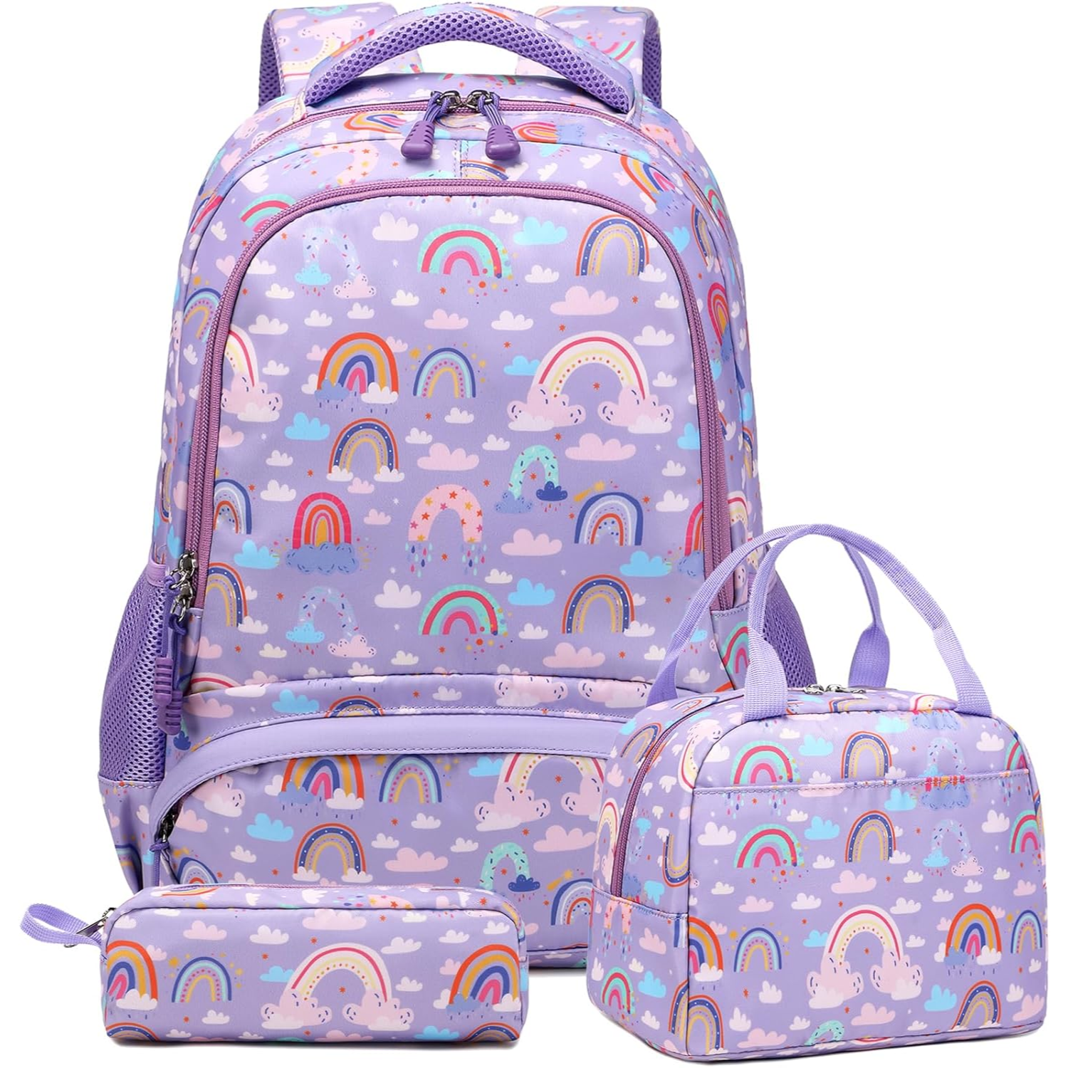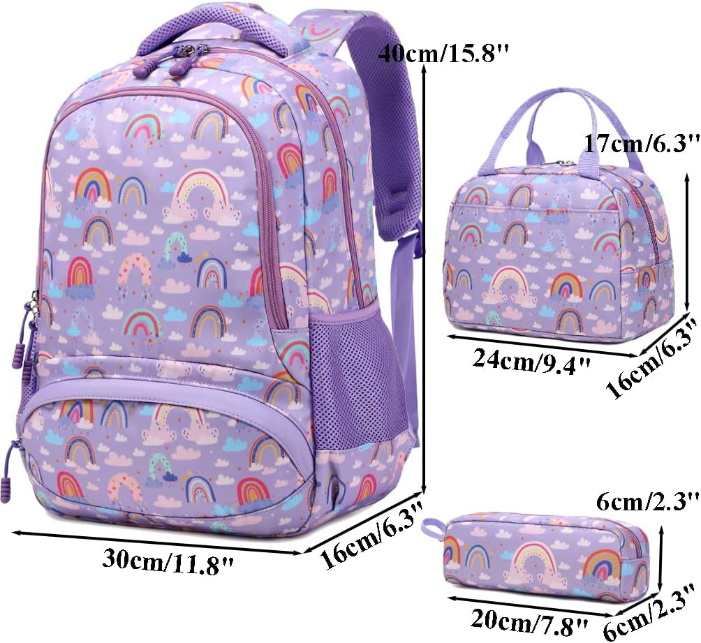 Conjunto Escolar Purple Rainbows 40 cm - Mochila + lancheira + porta-lápis