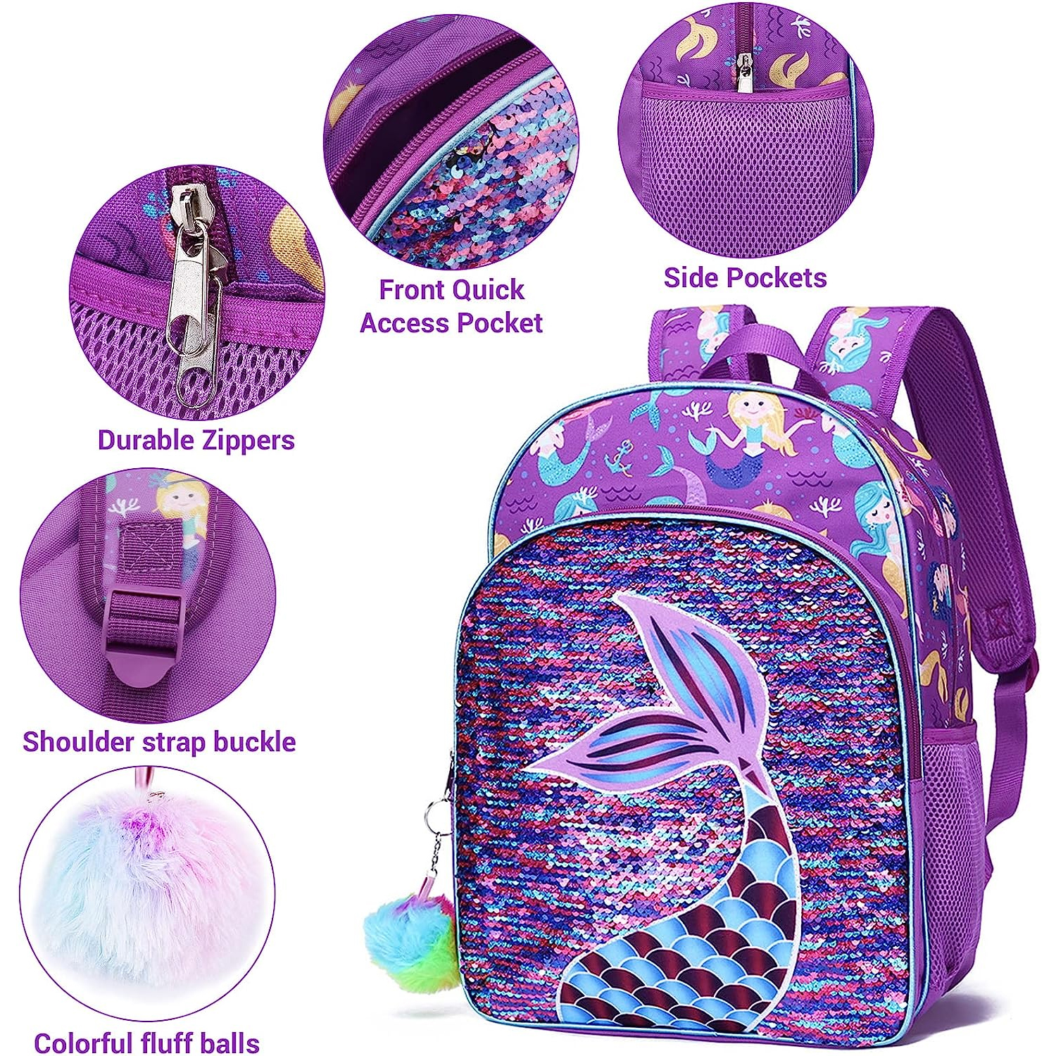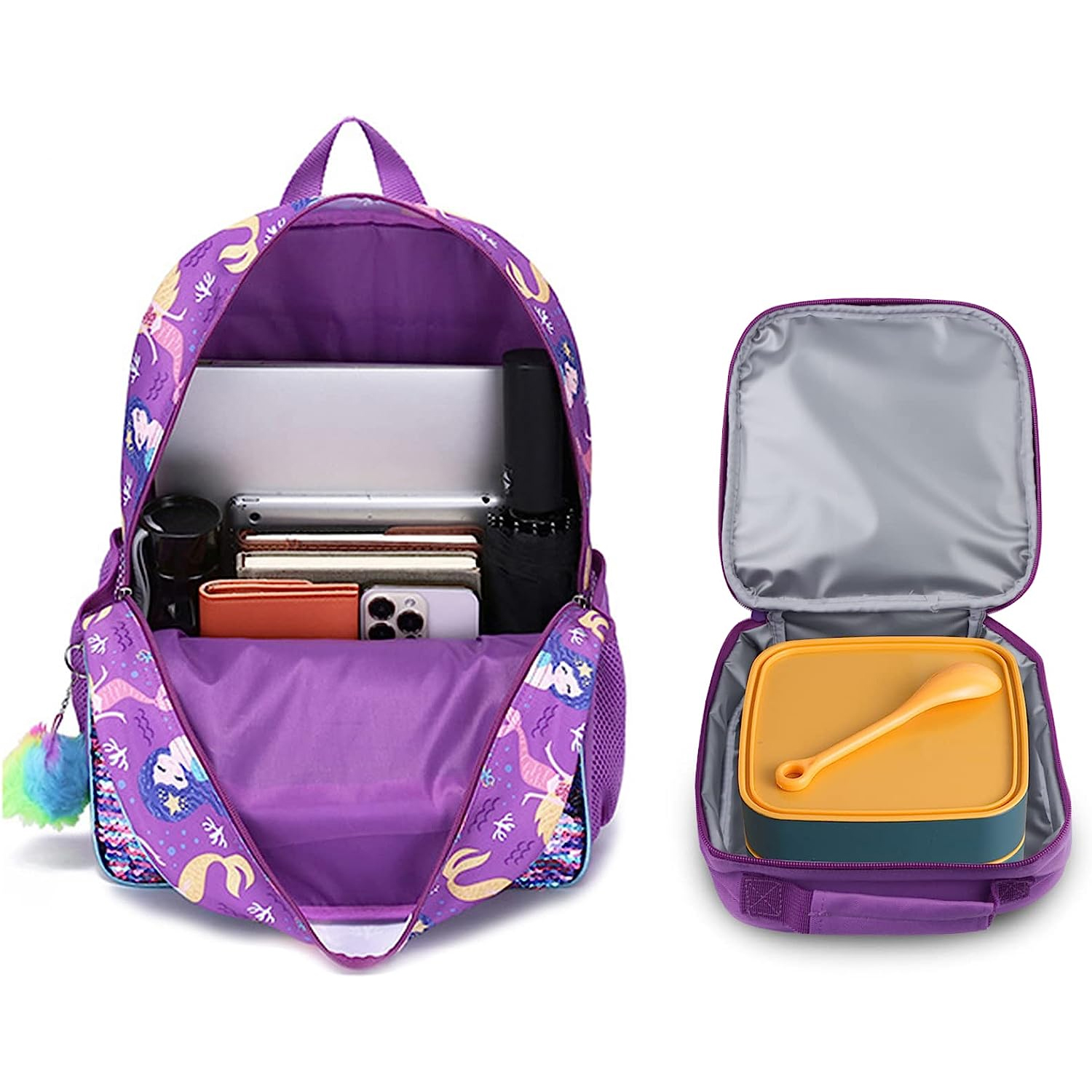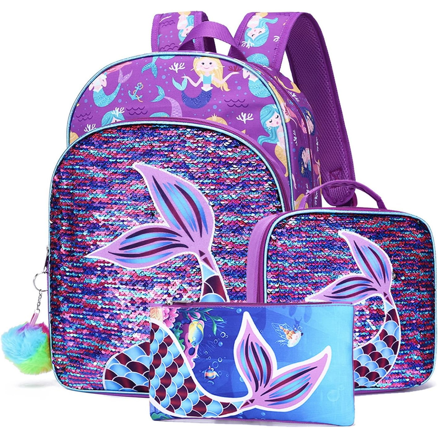 Conjunto Escolar Sereia Roxa - Mochila + lancheira + porta-lápis