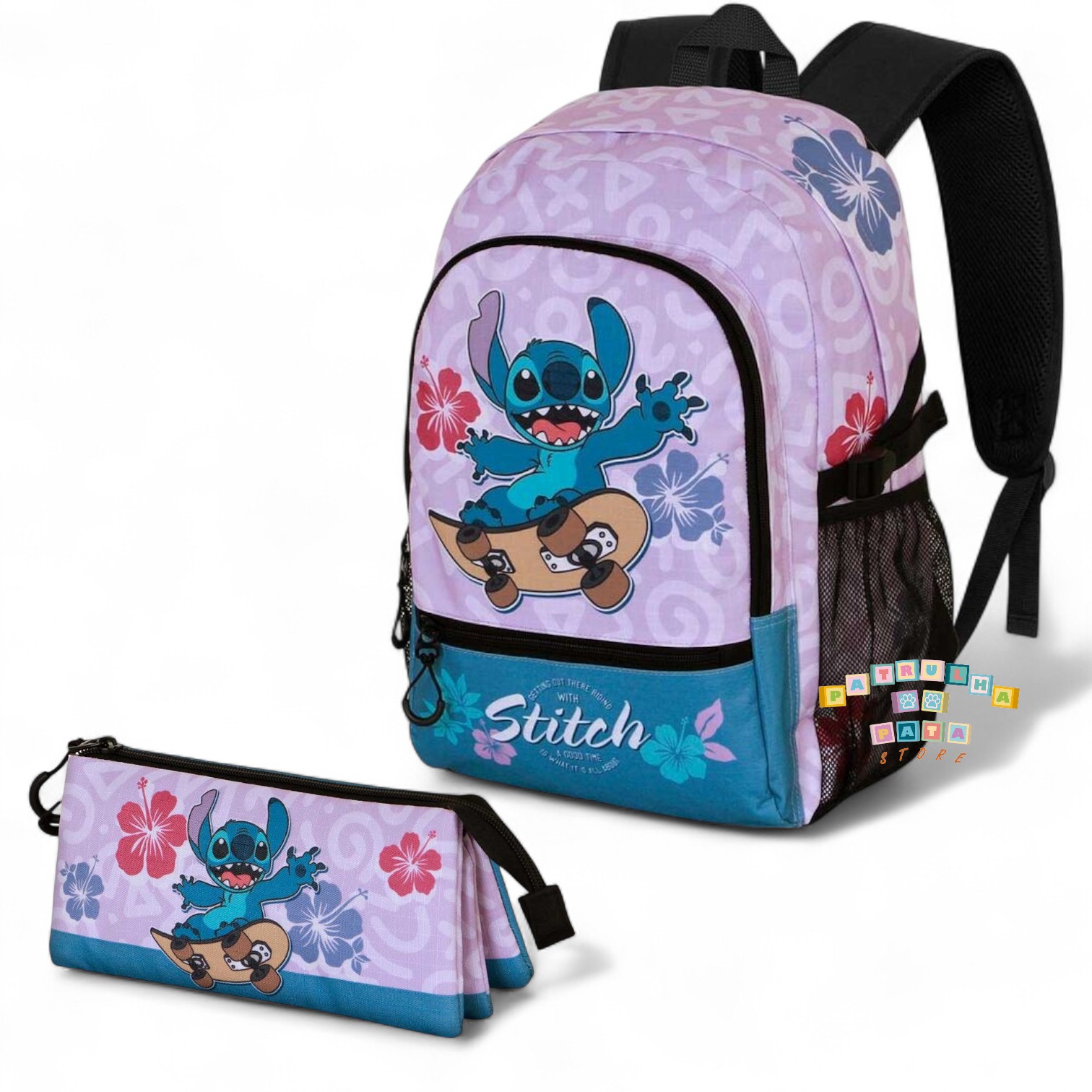 Conjunto Escolar Skate Stitch Disney - Mochila escolar 44cm adaptable + porta-lápis triplo