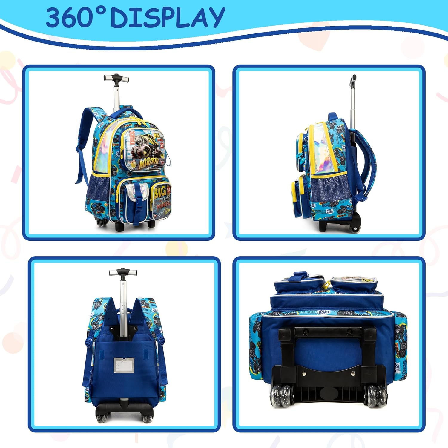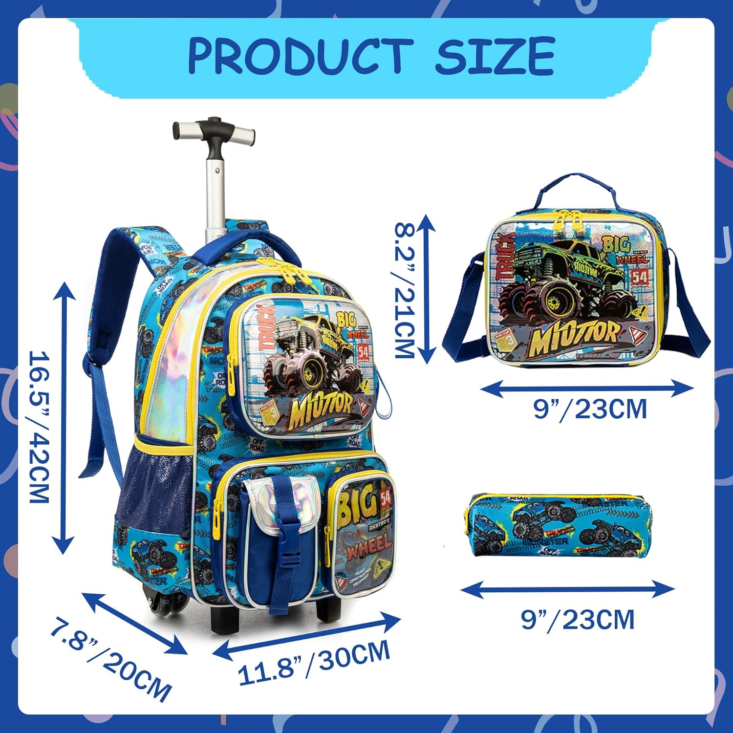 Tamanho: Mochila rodas criança: 43 cm x 30 cm x 20 cm, volume 24 litros; lancheira: 23 cm x 20 cm, volume 5 litros; estojo: 23 cm. Grande capacidade: mochilas escolares com rodas com grandes compartimentos e bolsos, esta mochila pode organizar livros, computadores, guarda-chuvas, garrafas de água, artigos de papelaria e muito mais. Material: o design de 2 rodas com um eixo de liga de alumínio de alta resistência não só garante que possa girar suavemente e sem desgaste, mas também o torna fácil e natural. Confortável: a mochila escolar infantil com rodas pode contribuir de forma mais eficaz para reduzir a pressão nas costas, tornando a coluna mais saudável e protegendo-a do peso. A barra do carro de alumínio tem 2 configurações de comprimento, durável e forte.