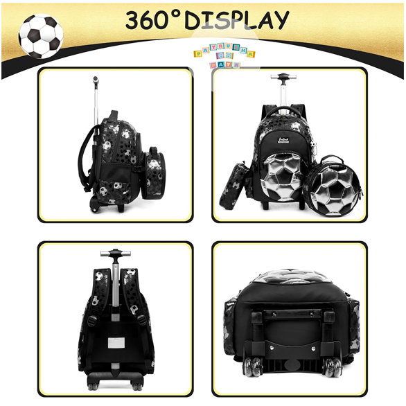 Capacidade da mochila rolante para crianças: 1 compartimento principal grande com 1 bolso para laptop com 2 bolsos frontais com fecho; 2 bolsos de malha para garrafa