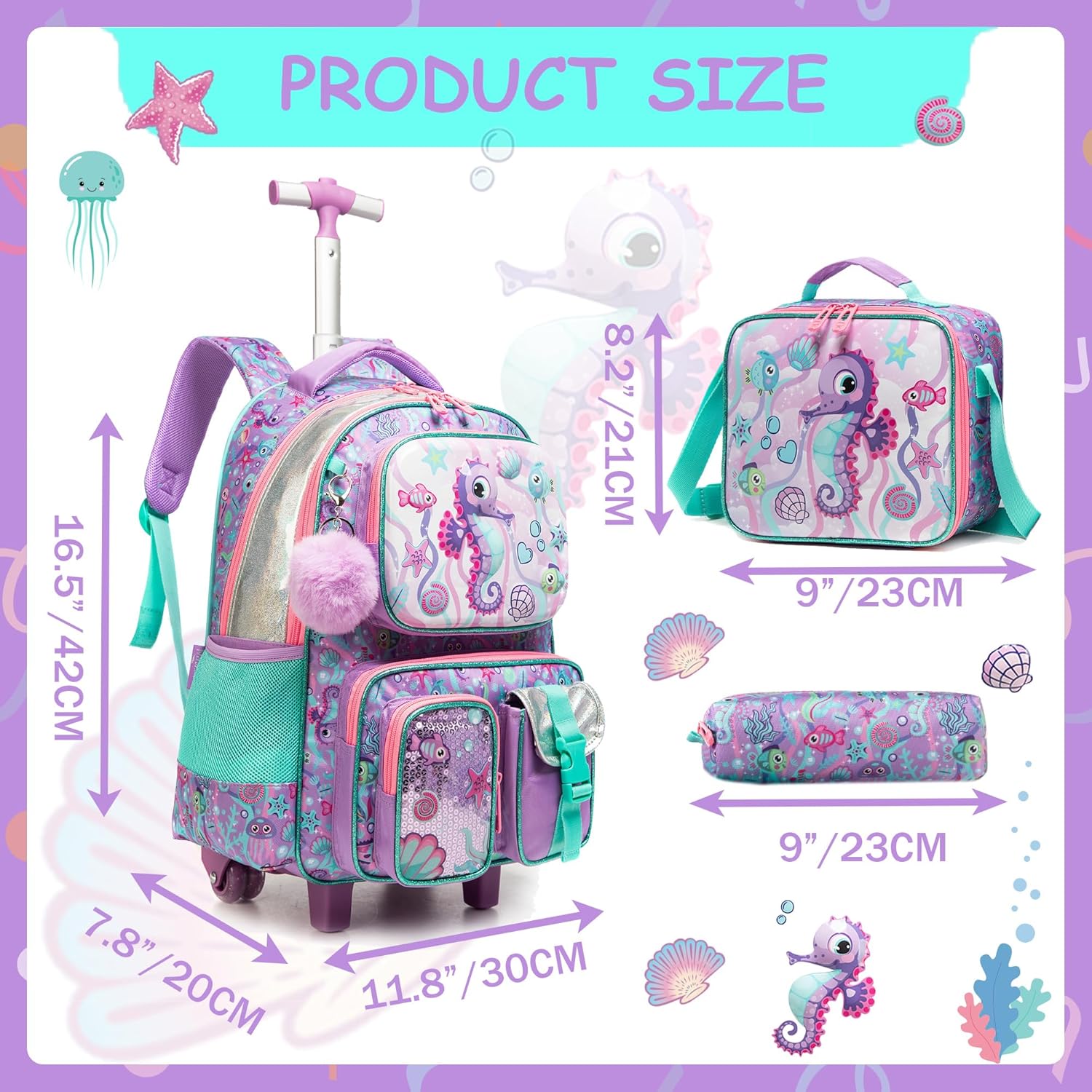 Tamanho: Mochila rodas criança: 42 cm x 30 cm x 20 cm, volume 24 litros; lancheira: 23 cm x 20 cm, volume 5 litros; estojo: 23 cm. Grande capacidade: mochilas escolares com rodas com grandes compartimentos e bolsos, esta mochila pode organizar livros, computadores, guarda-chuvas, garrafas de água, artigos de papelaria e muito mais. Material: o design de 2 rodas com um eixo de liga de alumínio de alta resistência não só garante que possa girar suavemente e sem desgaste, mas também o torna fácil e natural. Confortável: a mochila escolar infantil com rodas pode contribuir de forma mais eficaz para reduzir a pressão nas costas, tornando a coluna mais saudável e protegendo-a do peso. A barra do carro de alumínio tem 2 configurações de comprimento, durável e forte.