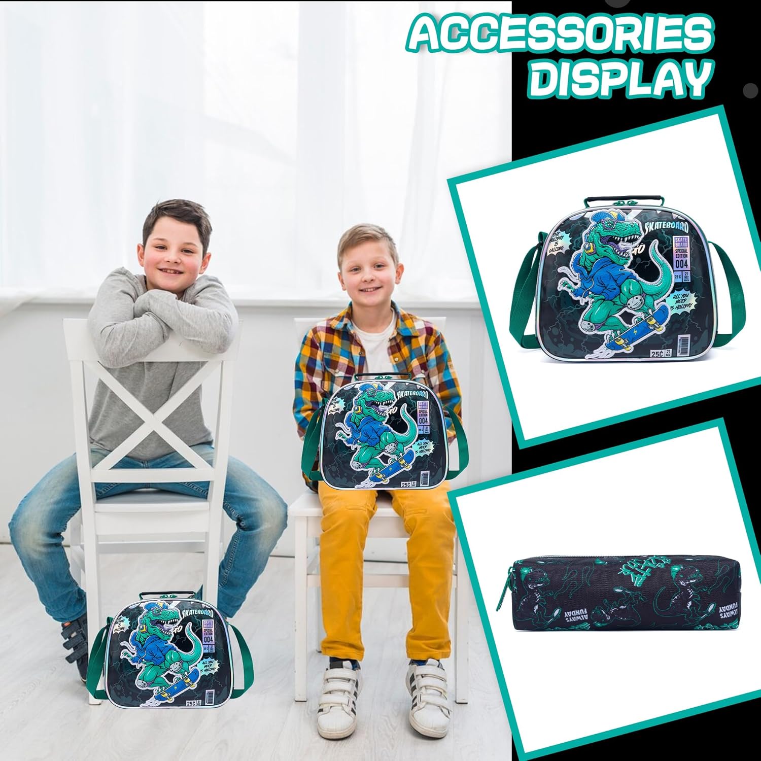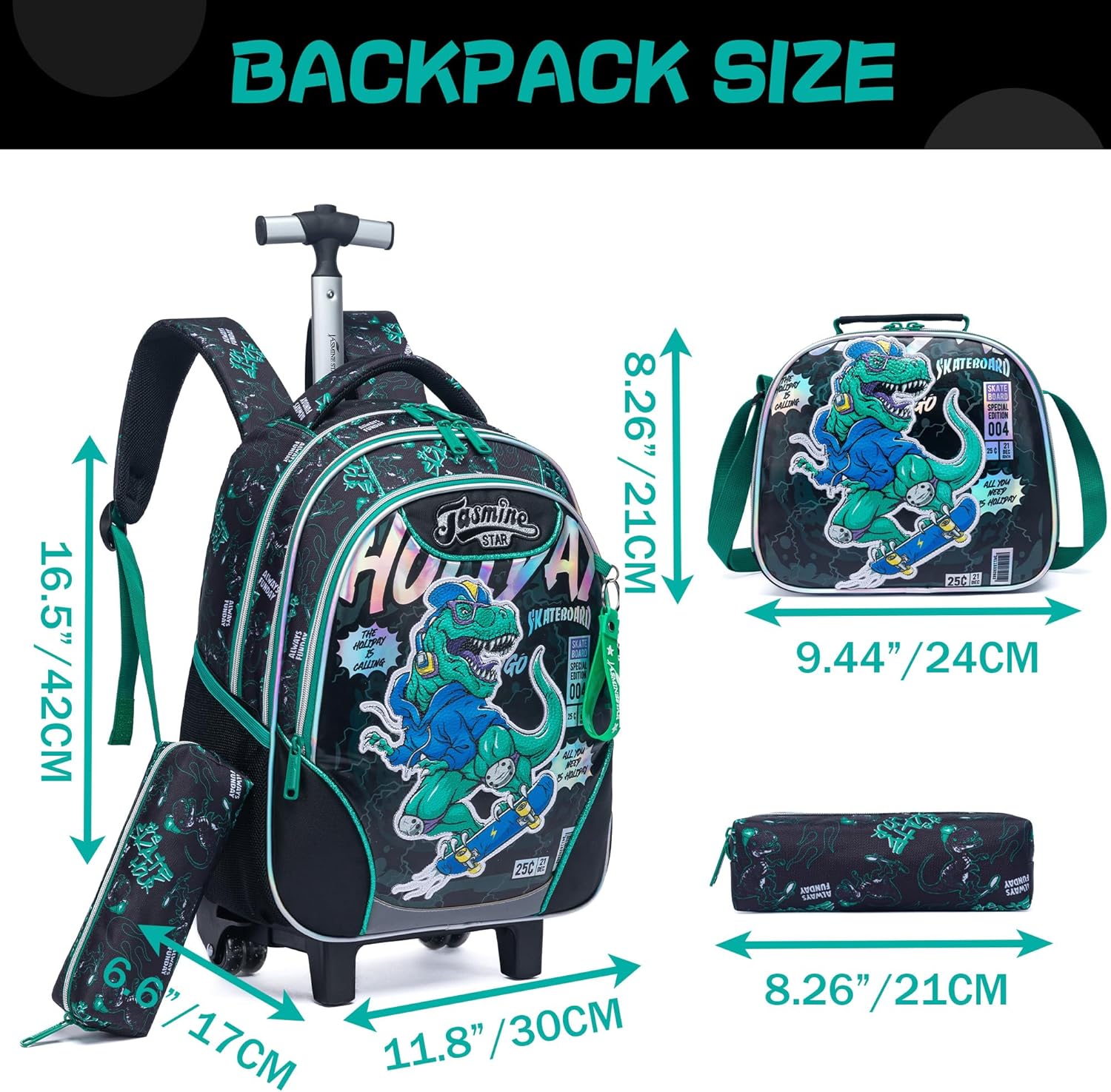 Conjunto Escolar Trolley Dino Skater - Trolley + lancheira + porta-lápis