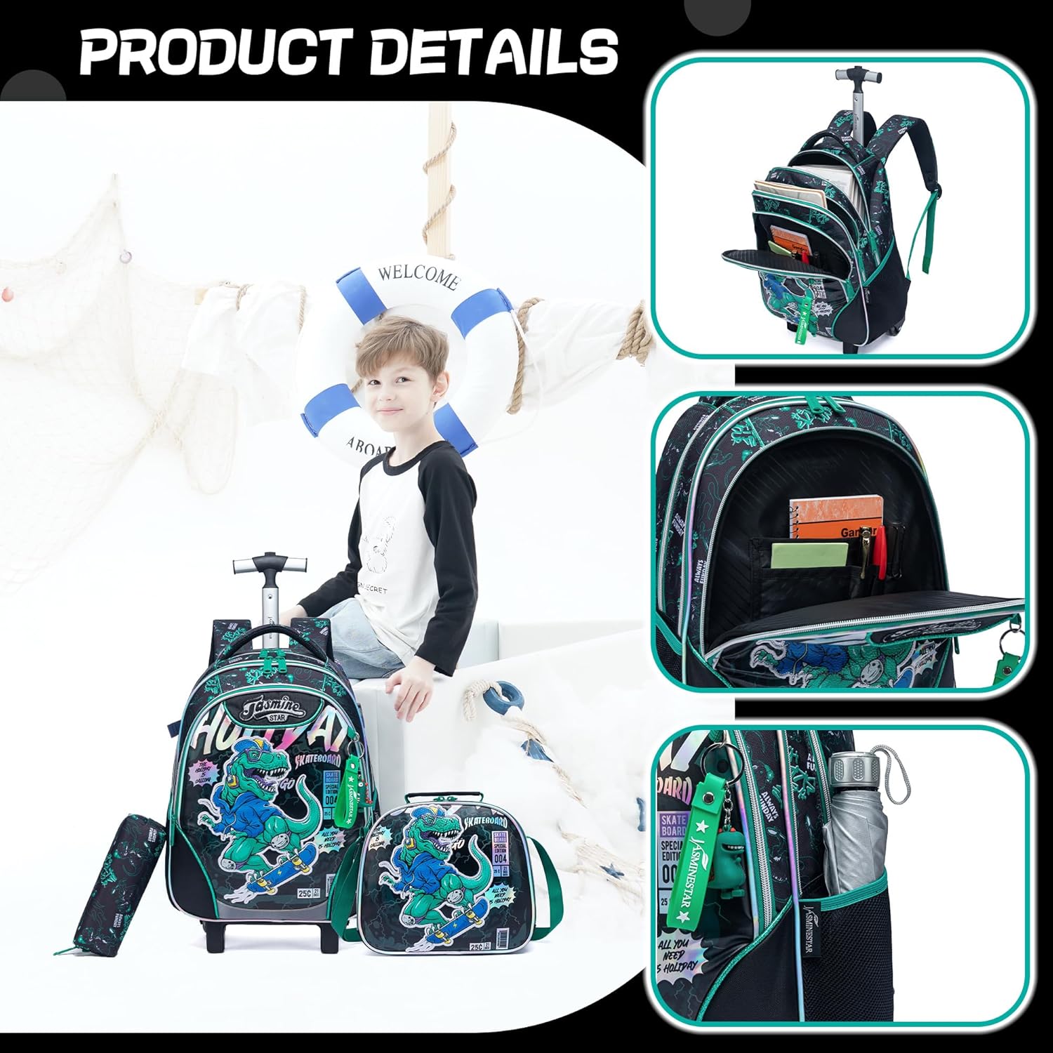 Capacidade: mochila rodas com 1 compartimento principal, grande o suficiente para um portátil de 14" e pastas, 1 compartimento com fecho de correr, pode guardar livros, roupas, brinquedos e aperitivos. 2 x bolso frontal para chaves, cartões e canetas. 2 x rede lateral para garrafas de água dobráveis ou guarda-chuvas.